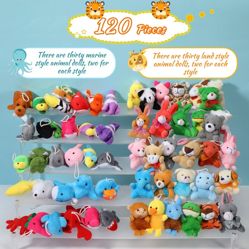 - Package Includes: you will receive totally 120 pieces mini plush animal toys set include animal and ocean animal 60 styles, 2 pieces for each style, sufficient quantity and different designs can meet your different decorative needs, surprise your cute kids or just share them with your friend