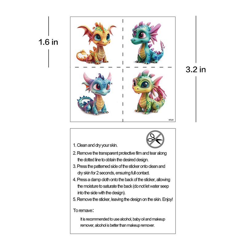 - 𝗘𝗮𝘀𝘆 𝘁𝗼 𝘂𝘀𝗲 𝗮𝗻𝗱 𝗿𝗲𝗺𝗼𝘃𝗲: Our dinosaur temporary tattoos are very easy to use, just choose the style you like and peel it off from the dotted line. Place it on clean, dry skin, lightly moisten it with water, wait 10 seconds and then peel off the film. Removal is also easy, just wipe it off with hand sanitizer, or soap.