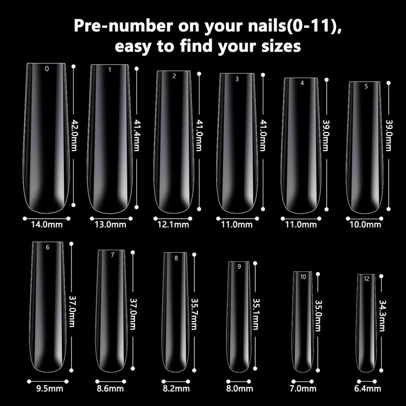 - 12 VARIOUS SIZES: Our extra long clear nails tips with a clear box offer 12 different sizes,10pcs each size, which numbered 0-11, very easy to find your desire sizes of nail tips
