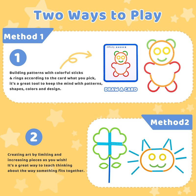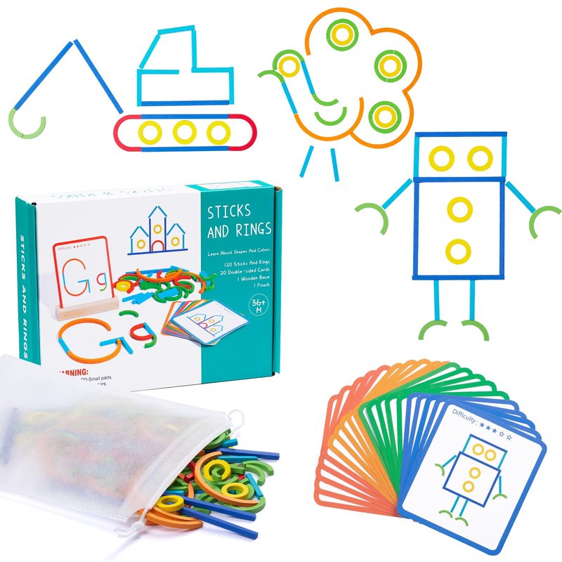 - 【Creative Sticks And Rings】Our construction toy includes 120pcs sticks and rings, 20pcs double-sided cards, 1pcs wooden base, 1pcs storage bag. Building and create letters or patterns with colorful sticks and rings, such as animals vehicles and more. Kids can trying to figure out what pieces make the designs on the cards and create their own design. A great STEM building toy will be favorite gift toys for children
