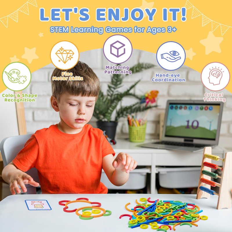 - 【Fun & Educational Preschool Toys】Colorful sticks and rings will attract children's attention, Children are very happy to build different patterns, even create their own designs. Create anything you want using Sticks & Rings and watch them come alive. Playful practice for preschoolers/pre-readers. Montessori educational toys gets your kids distracted away from the TV or tablets for a long time. At the same time, you will have enough time to do whatever you need to do peacefully and quietly