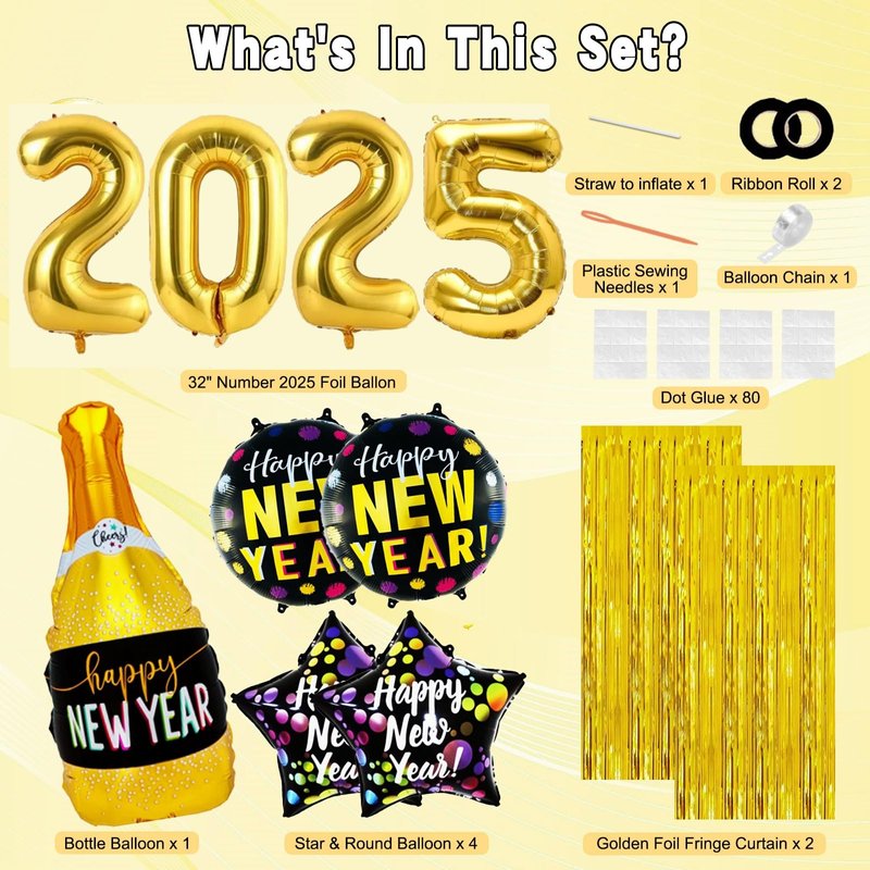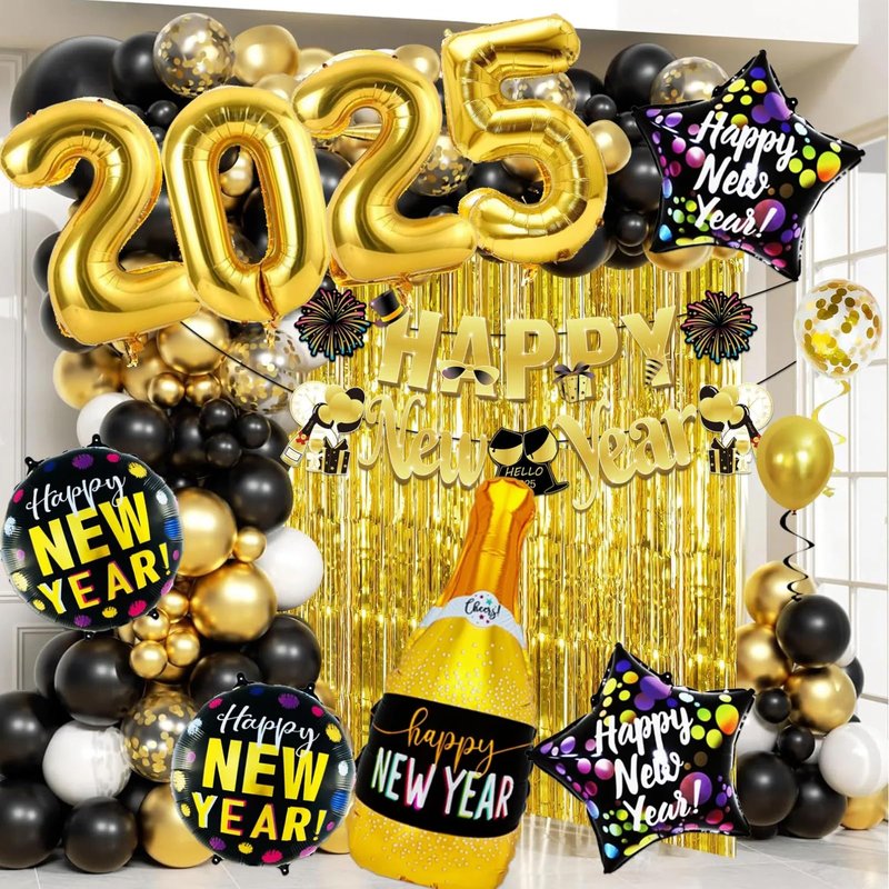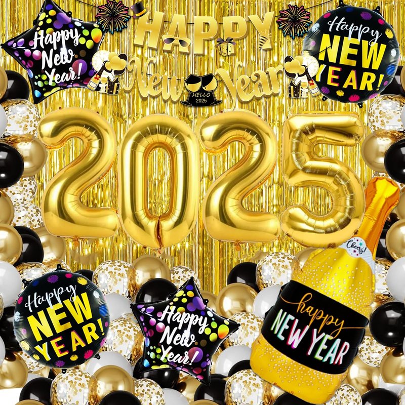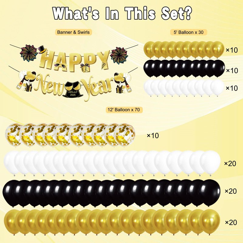 - Complete Celebration Package:This 121pcs New Years Eve party set includes: Happy New Year Banner*1, Foil Fringe Curtains*2, "2""0""2""5" Number Balloon, Champagne Bottle Foil Balloon*1, Star Foil Balloons*2, Round Foil Balloons*2, 12"Latex Balloons*70(Black*20, Gold*20, White*20, Confetti*10), 5"Latex Balloons*70(Black*10, Gold*10, White*10), ABS Plastic Sewing Needle*1, Inflatable Straw*1, Ribbon*2, Dot Glue*4, Balloon Chain*1.