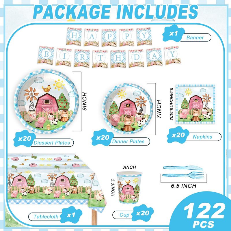 122PCS Farm Animal Party Supplies for Boys Baby Shower Party Blue Barn Animal Theme Birthday Decorations Barnyard Tableware Set Plate Napkins Forks Dinnerware for 20 Guests