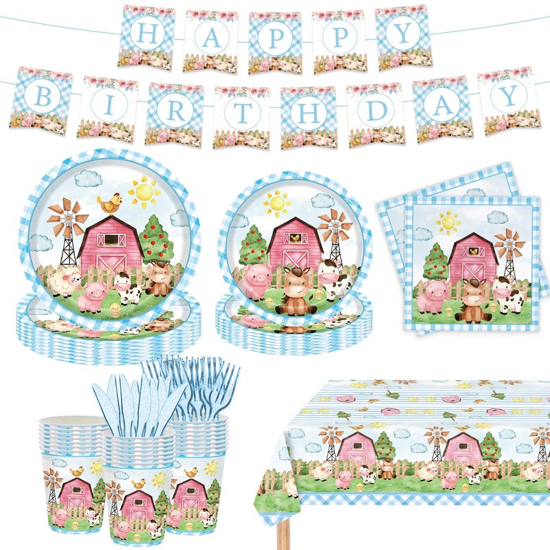- 【Serve 20 Guests】This Farm party kit has all you need for 20 guests,includes 20pcs 9'' dinner paper plates, 20pcs 7'' dessert plates, 20pcs paper napkins, 20pcs paper cups,20pcs plastic forks and knives,1pcs Banner,1pcs tablecloth.