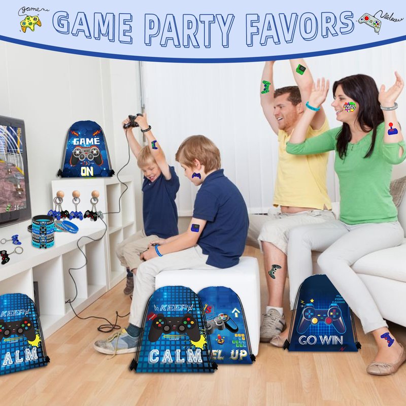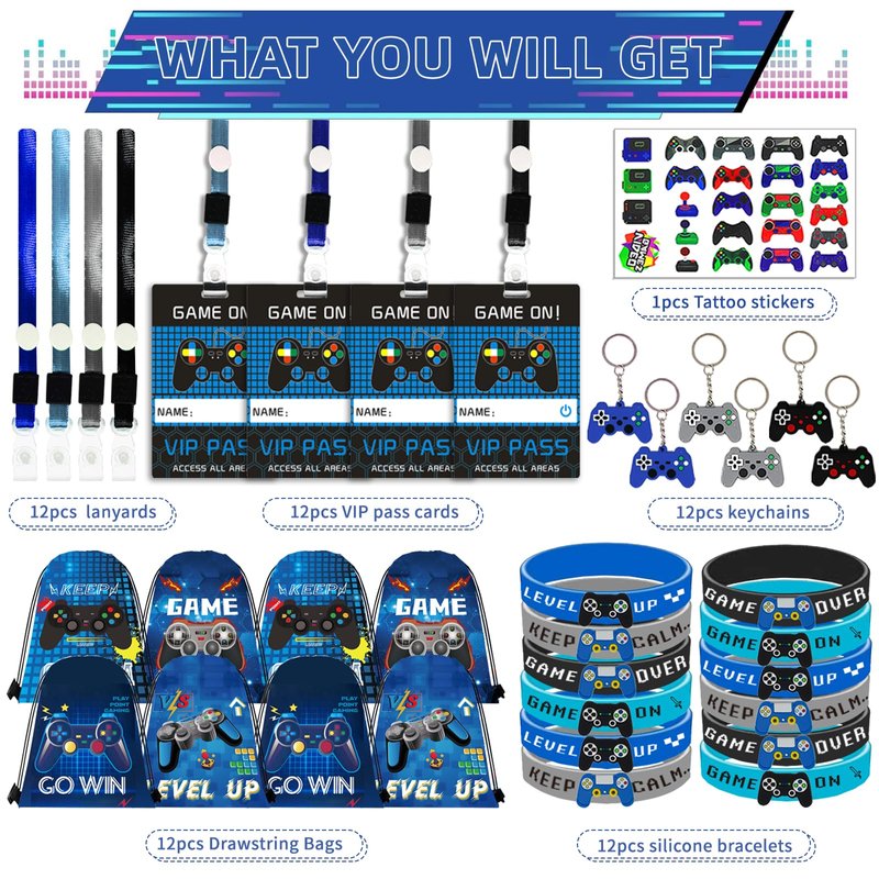 - Super Value Video Game Party Favors: Gamer party favors include include 12pcs super capacity video game party drawstring bags, 12pcs bracelets, 12pcs shoe charms,12pcs key chains and 1pcs tattoo sticker with 50pcs patterns, 12 video game VIP pass cards (with 12 Lanyards). The gaming party favors can not only meet your party needs, but also be used in daily life, which adds fun to the party and brings convenience to life!