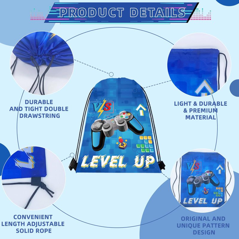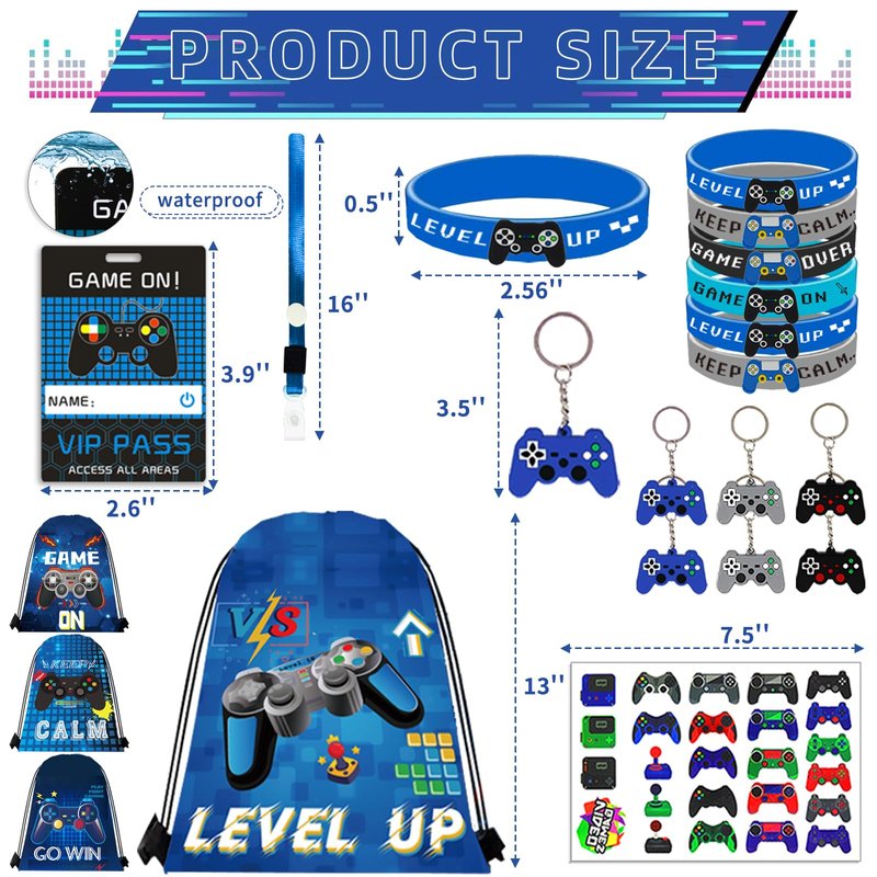 - Perfect Gamer Party Favors Experences: Our video game party favors with the game theme word design, can be a good addition to the game theme party atmosphere. The drawstring bag is designed by us, using classic game colors and combining various game themes words to make your gamer party drawstring bag unique and dazzling. The game party gift also comes with bracelets, keychains, VIP pass tickets and tattoo stickers. Video game birthday decorations making your gaming party more fun and popular.