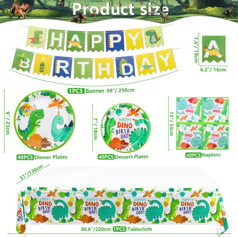 - Dinosaur Party Supplies Includes: 40 X 9” dinner plates, 40 X 7” dessert plates, 40 X Napkins, 2 X birthday table cover, 1 X HAPPY BIRTHDAY banner. You will receive 123 Pack for Dino birthday party decorations.