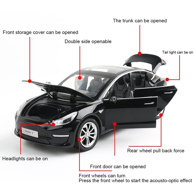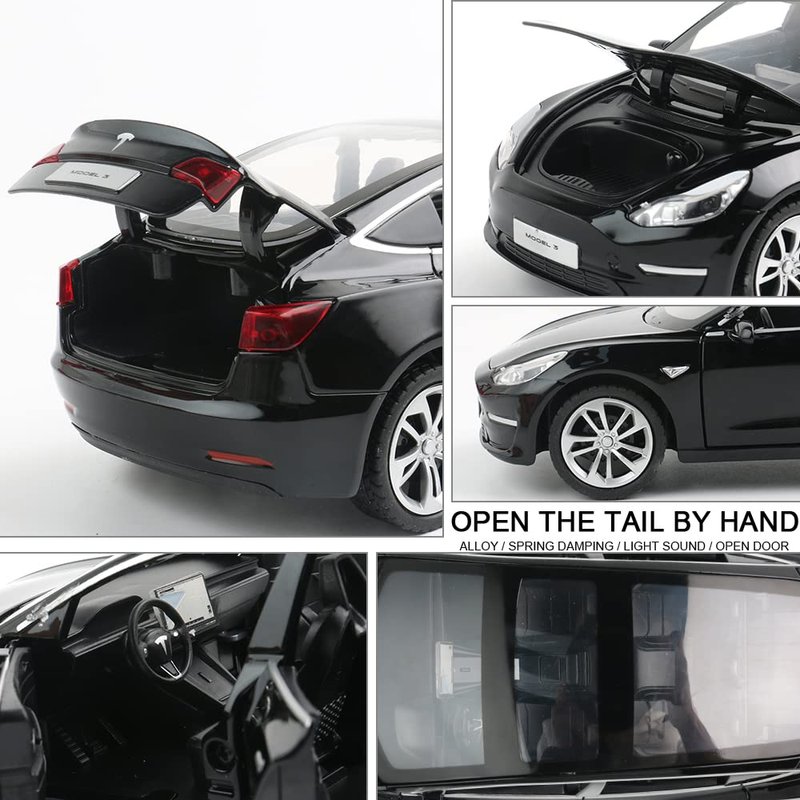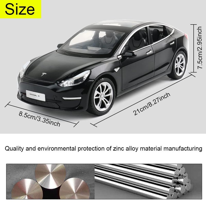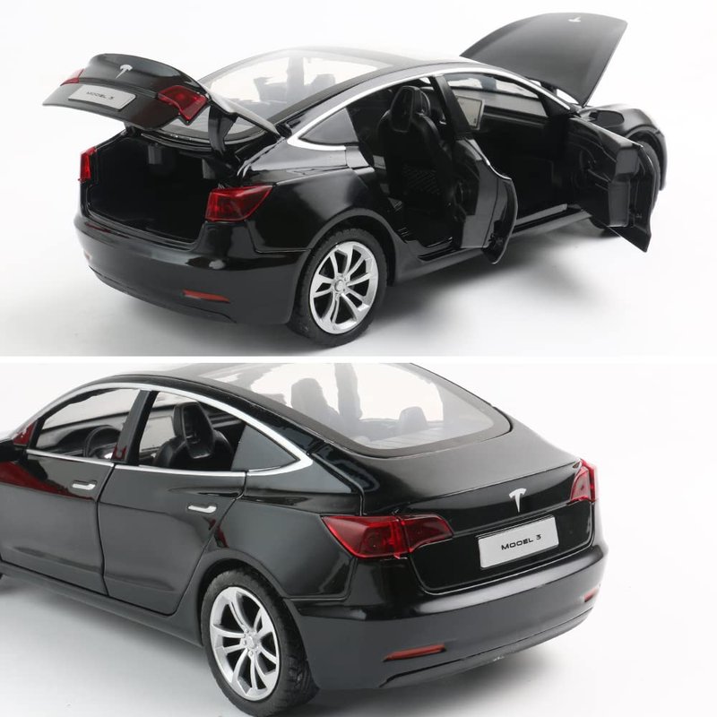 1/24 Diecast Model 3 Toy Car, Alloy Casting Pull Back Collectible Car Vehicles with Sound and Light, 6 Open Doors, Tesla Big Model 3 Car Model Toy for Kids Adults Birthday Gift (Black)
