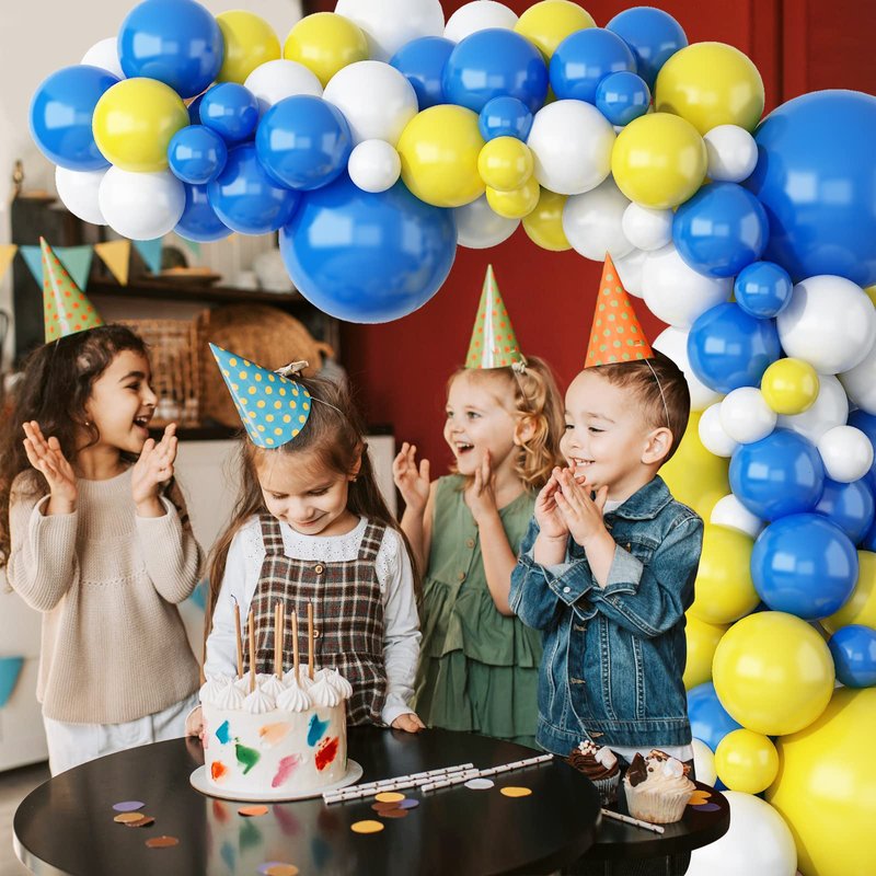 - 124PCS Party Balloons Decorations - The combination of white yellow blue balloons is brilliant and attractive, which are bright decorations in the party, you can use the color ribbons to tie the balloons on the party, or other decoration tools to make the balloon more funny. They can bring more pleasure to children for Playing with balloon.