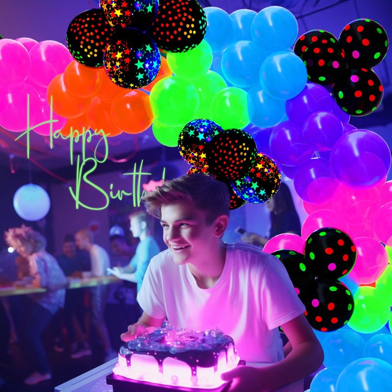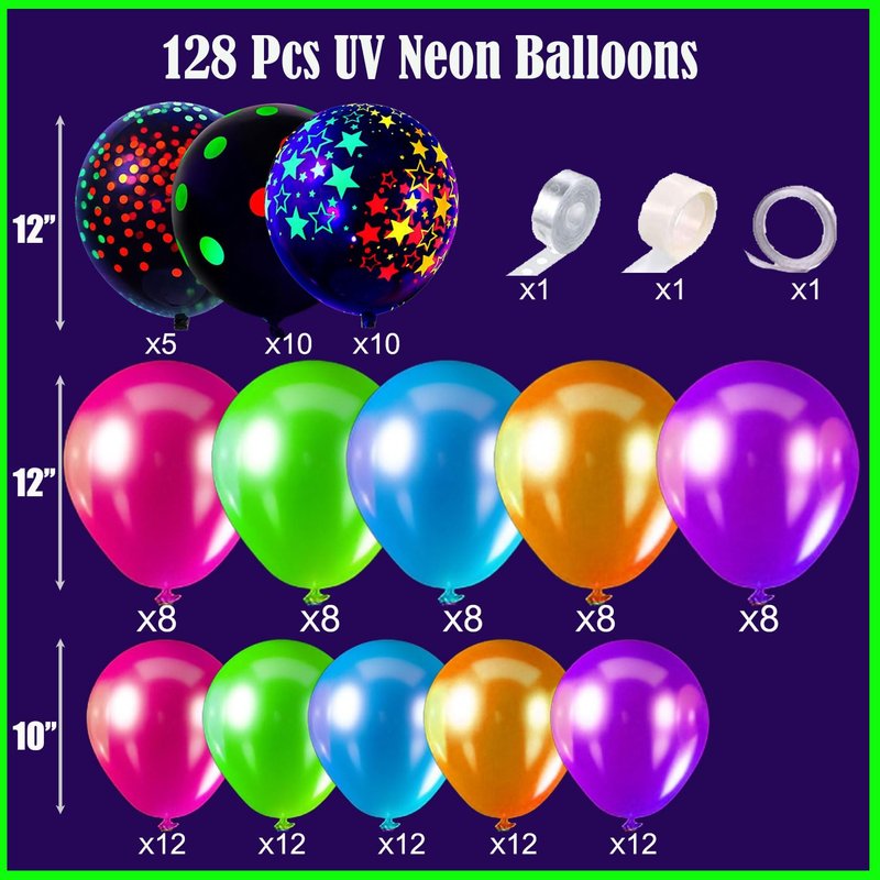 - 【UV Reactive Neon Balloon Set】: Elevate your glow-themed event with 128 pcs of brilliant Fluorescent neon balloons in red, orange, green, blue, and purple and 3 balloon tools. Perfect for disco parties, neon events, or lively bachelorette celebrations, these glow-in-the-dark balloons create a striking visual effect under blackligh