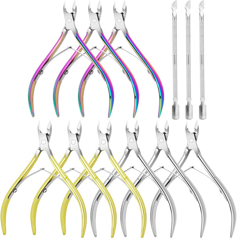- Packing Included 12 Pack Cuticle Nipper: Set Contains 3 Pcs Golden Cuticle Nipper,3 Pcs Rainbow Cuticle Nipper,3 Pcs Sliver Cuticle Nipper And 3 Pcs Cuticle Pushers; Cuticle Nipper Total Length Approx: 4.1 Inch.