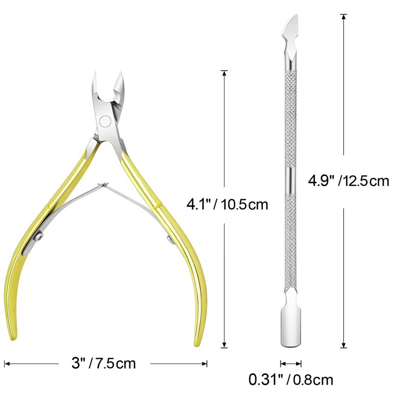 Specifications: Material: stainless steel Packing:12 Pack Cuticle Nipper 3 X Golden Cuticle Nipper, 3 X Rainbow Cuticle Nipper, 3 X Sliver Cuticle Nipper 3X Cuticle Pushers Cuticle Nipper Total Length Approx: 4.1 Inch/10.5CM Dual End Cuticle Pusher Total Length Approx: 4.9inch/12.5CM Each cuticle nipper is protected by a plastic cover. After use, please close the cover in time to avoid accidental cuts. Can be disinfected with alcohol wipes before and after using cuticle scissors.