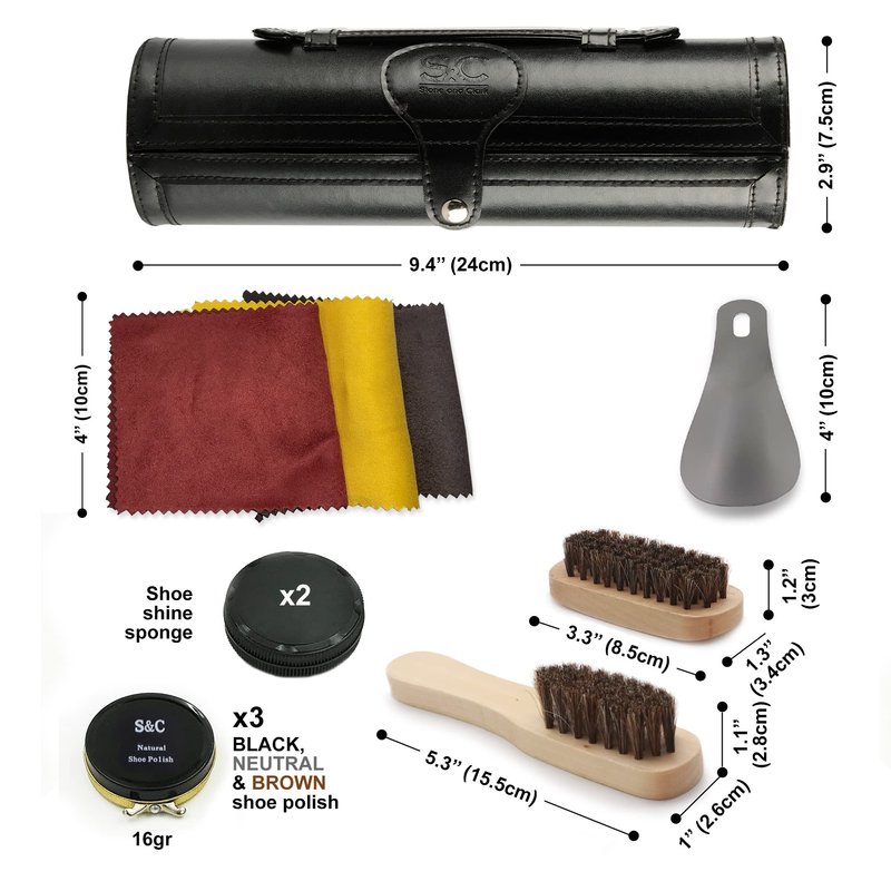 Give Your Shoes The Best Don’t settle for less than the best when it comes to your shoes. Preserve and protect your leather footwear with this polish brush kit, and always put your best foot forwards. Use this leather shoes brush and polish kit for scuffs, scratches and general polishing. Pack it with you for day trips, business travels, or just for a long day at the office. Keep your shoes clean, classy and polished—all day, everyday. Includes Premium PU Leather Case x 1pc Metal Shoe Horn x 1pc Neutral Wax Polish x 1pc Brown Wax Polishx x 1pcBlack Wax Polish x 1pc Polish Applicator Horse Hair Brush x 1pc Buffing Horse Hair Brush x 1pc Buffing Cloth x 3pc Shine Sponge x 2pc How To Shine Your Shoes Step 1—Clean: Remove laces from shoes. For best results, wipe your shoes thoroughly clean with a damp cloth to remove any dirt or debris, which can get embedded in leather if it is not cleaned off prior to polishing. Allow shoes to dry before applying polish. Step 2—Condition: If leather is dry or cracked, apply a leather conditioner with a clean cotton cloth and allow to dry before moving to the next step (leather conditioner NOT included with kit). Step 3—Shine: Use the shine sponge to apply shoe wax evenly to the entire body of the shoe. Use the small brush to rub polish deep into the area between the heel & shoe uppers. Take care to apply a thin, even layer of wax polish to avoid inconsistent spotting on the leather. Let the polish dry before proceeding to the next step. Step 4—Buff: Make your shoes shine! Start by brushing softly with the large brush; then move onto using the soft buffing cloth in a brisk side to side motion for the final shine