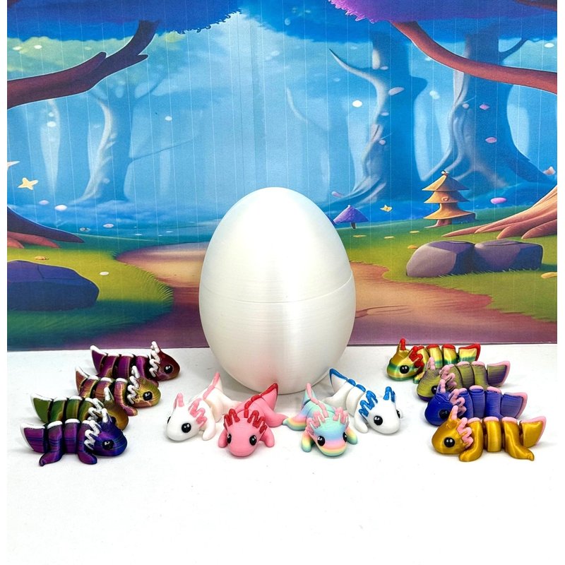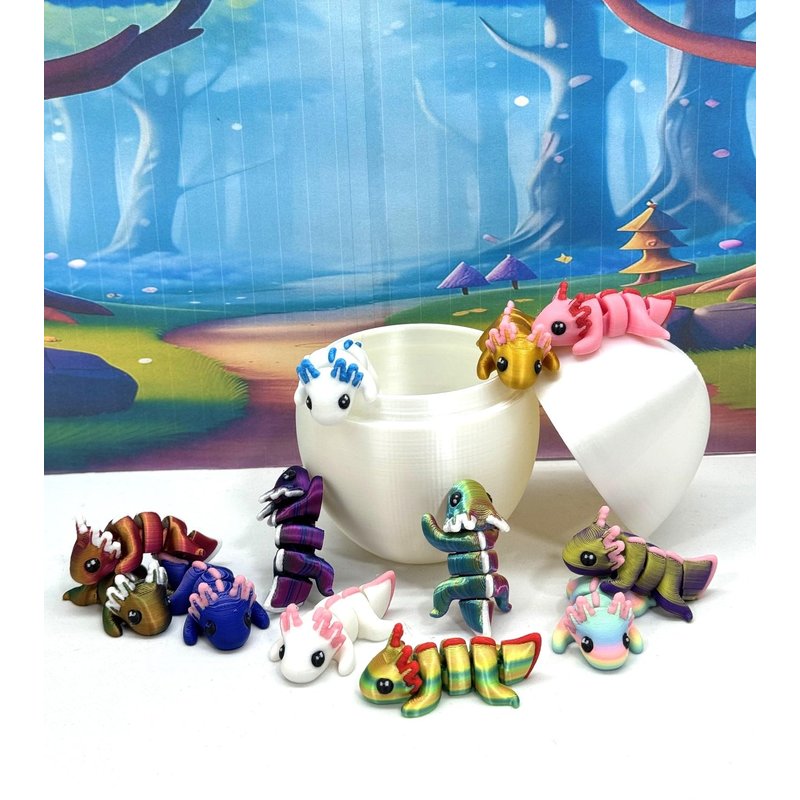 Introducing our 3D Printed ARTICULATED Mini Axolotl with Egg. Each mini Axolotl measures 1.75" long, very cute and articulated. These 12 pcs posable mini Axolotl are meticulously crafted with an eye for detail, this interactive desk accessory is not just a source of entertainment, it's also a stress-relieving toy and a chic decor piece for any space. ------- Small Components Advisory: ------- Please be mindful that this product may contain small components and may not be suitable for very young children. Due to the nature of 3D printing, there is a potential for small components to detach if handled aggressively or dropped. As such, we advise against allowing younger children to engage with the AXOLOTL. Please be aware that 3D printed objects may exhibit minor imperfections like layer lines, inherent to the printing process. While we strive for the highest quality, these imperfections contribute to the distinctive character of each piece, making each Axolotl uniquely crafted for you. The available color options are illustrated in the provided photos. Keep in mind that variations in color may arise from discrepancies in filament production and the characteristics of your monitor or screen. Additionally, the use of multi-colored filament rolls can influence color distribution in the prints. ------- Licensing Information: ------- Authorized Design: NOHo3D holds the official authorization for the production of this exquisite design created by Zou3D designs.
