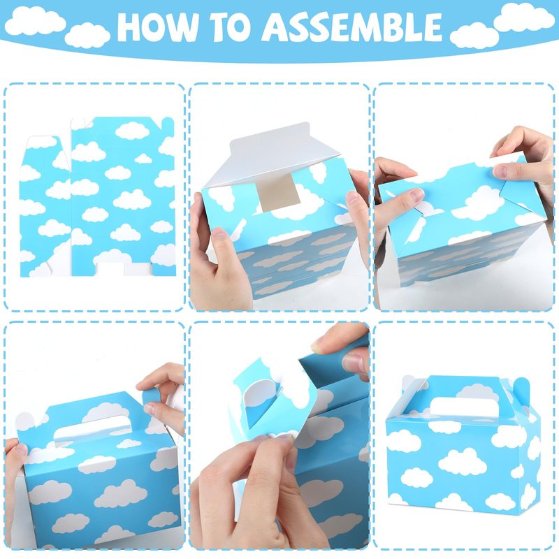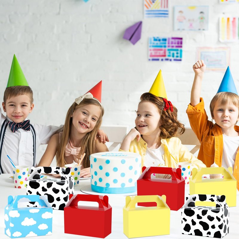 - Innovative Design and Vivid Colors: Our favor boxes are brightly colored with blue sky, white clouds, cow printing, and a combination of yellow and red. There are 4 designs in total, which combine to maximize the atmosphere of the cartoon story theme. It is especially suitable for toy birthday parties!