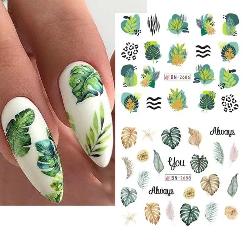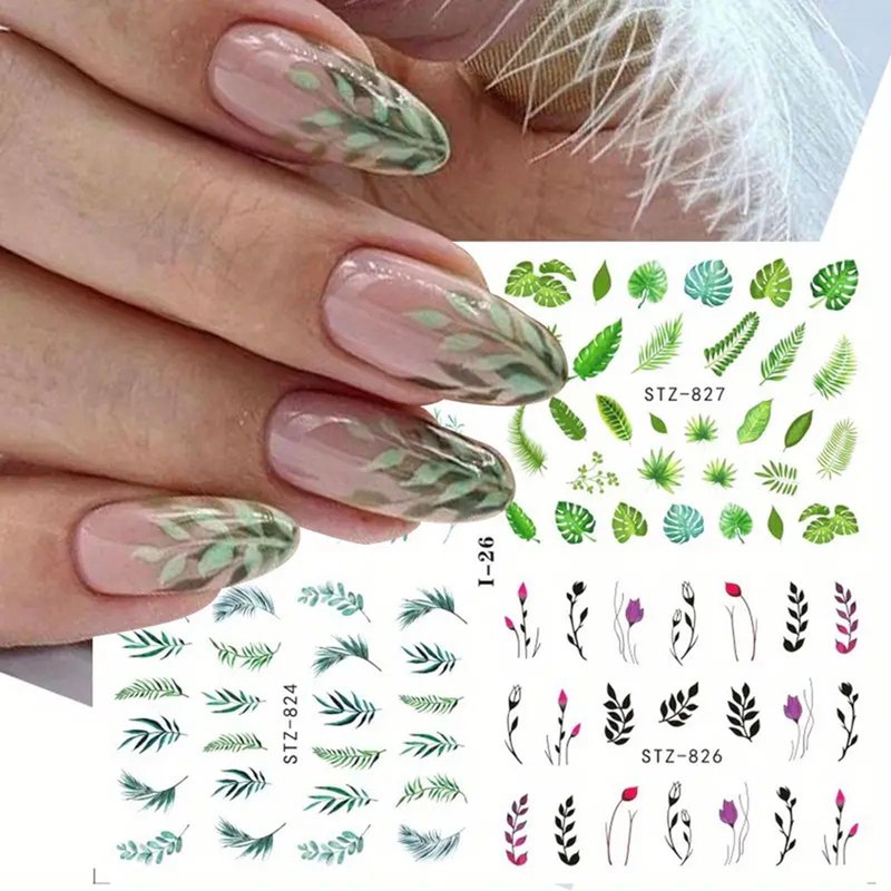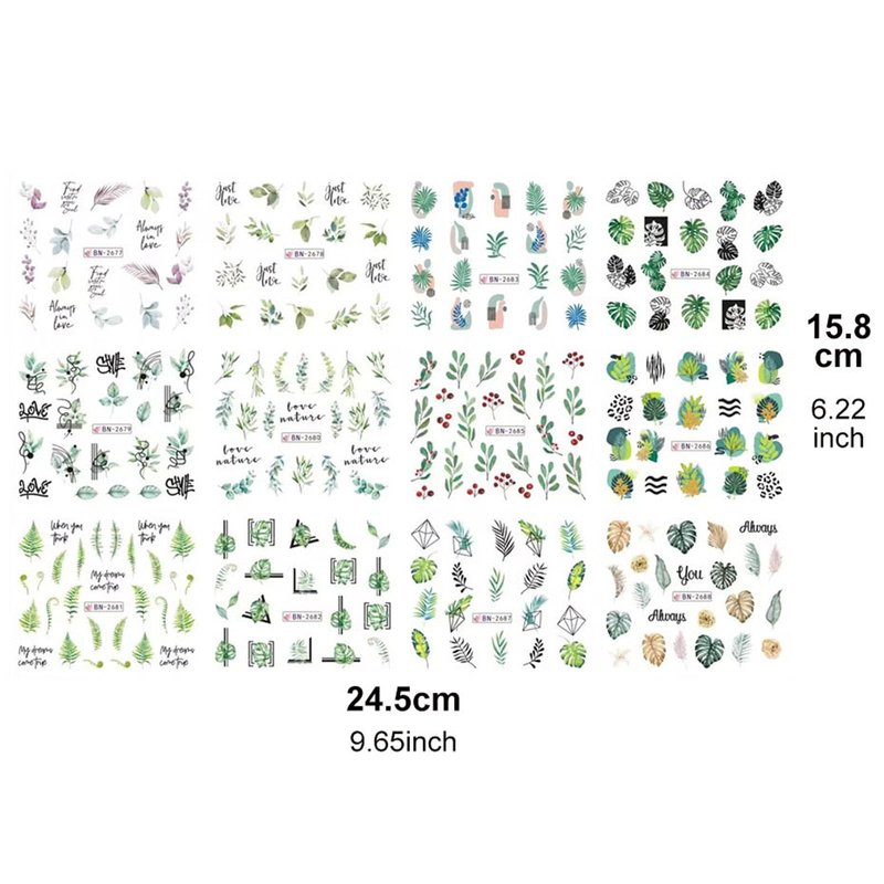 12pcs Green Leaf Nail Stickers - Diowino Water Transfer Nail Art Stickers Tropical Rain Forest Leave Series Nail Decals Nail Accessories for Acrylic Nails Women Girls