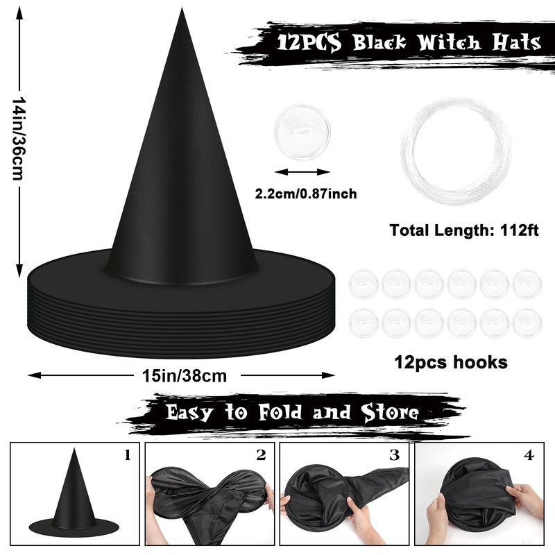 - 【Package Includes】-- You will receive 12 pieces halloween black witch hats, 1 roll of nylon hanging rope (112ft) and 12 pieces of seamless hooks (2.2 cm/ 0.87 inches) in one package, a rich and eye-catching decoration combination for Halloween party, enough for you to decorate the Halloween party, carnivals and more events.