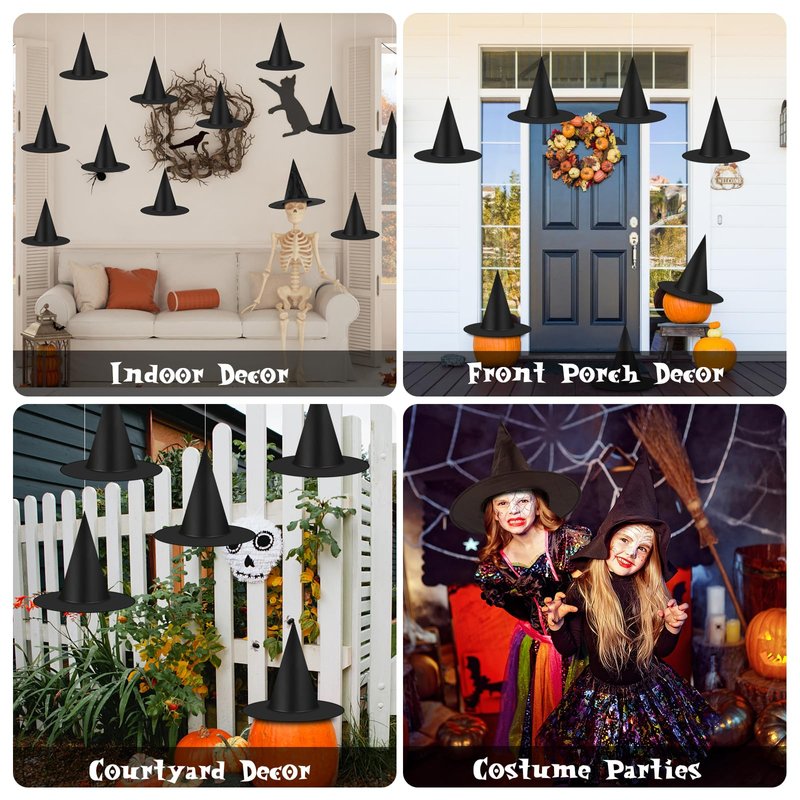- 【Wide Use】-- Our witch hat is a great accessory to match with your Halloween costume, and a great decorations to create a Halloween atmosphere indoors or outdoors. The black witch hats can also be used to decorate pumpkin monsters, garden monsters, or DIY floating witch hats. In addition, these Halloween witch hats are great gifts to family and friends for happy memories between you and them. And even use as trick or treat baskets.