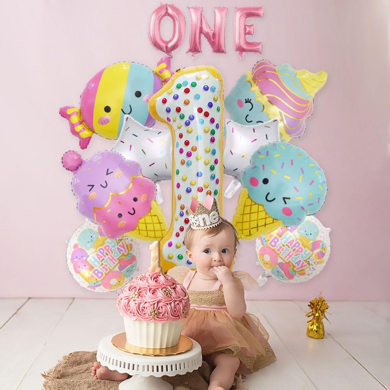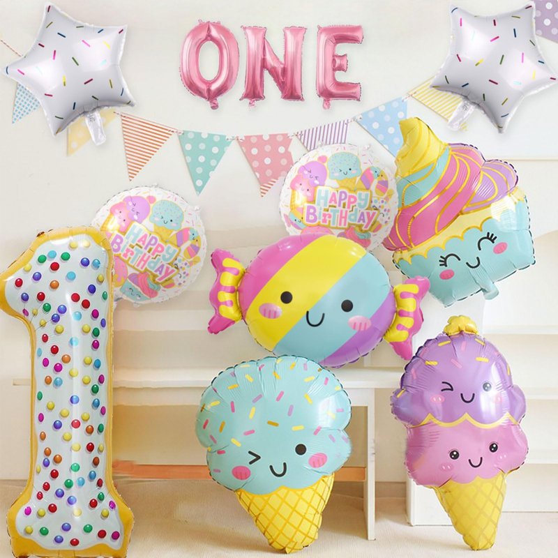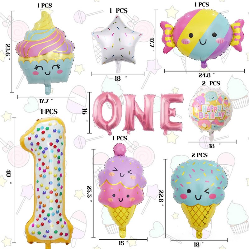 - GREAT PACK FOR 1ST BIRTHDAY DECORATIONS | CUTE Ice Cream: Package comes with 12pcs balloons : 1pcs 40” number 1 balloon, 3pcs 16" Letter balloons: ONE, 4pcs ice cream size about 31in, 2pcs 18” round candy Balloons, 2pcs 18 " white candy star balloons. Whether you're throwing a Ice Cream themed party decor at your little one’s birthday, these balloons set are sure to make a statement.