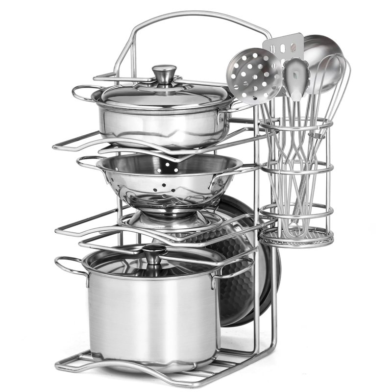 - The playset contains 12 Pcs common pots, kitchen utensils and rack, is often played with play kitchen set or food set.