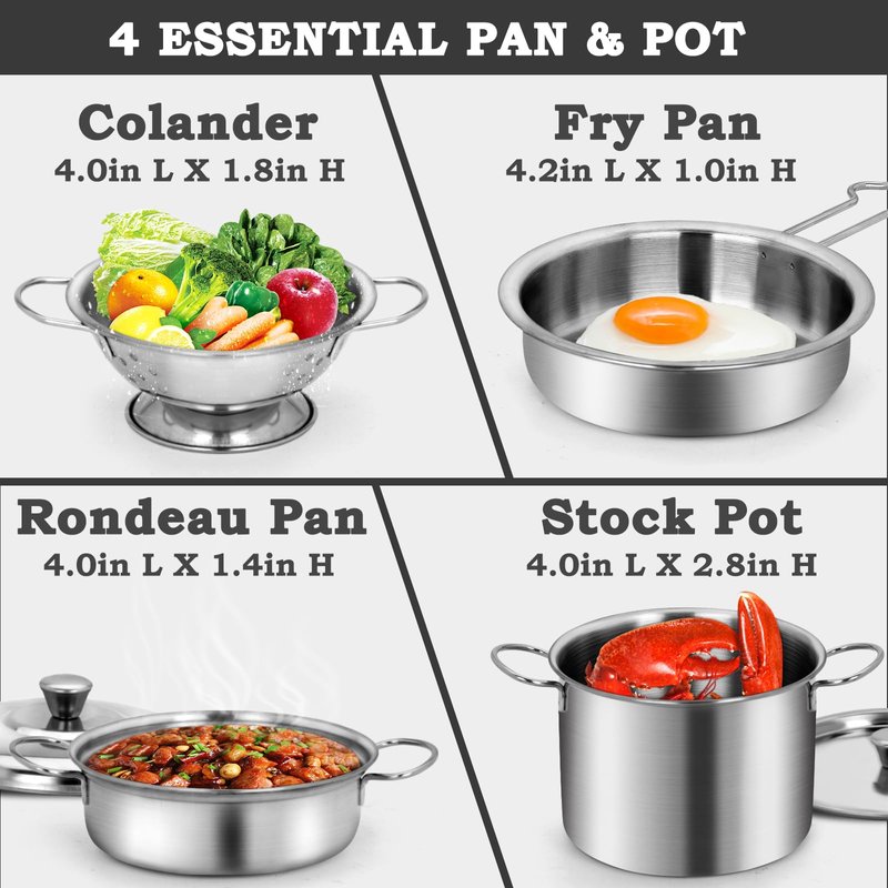 - There are 4pcs of pots and pans to cover all life scene, including 4inX1.8in Colander, 4inX1.0in Fry Pan, 4.0inX1.4in Rondeau Pan and 4.0inX2.8in Stock Pot.