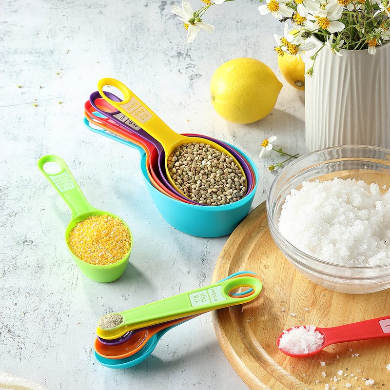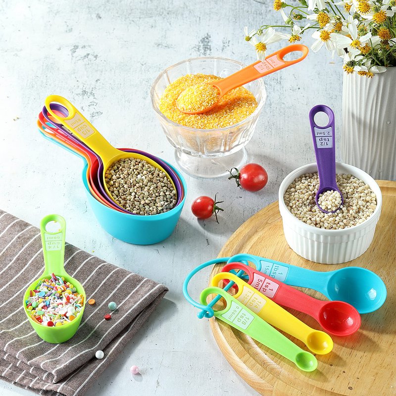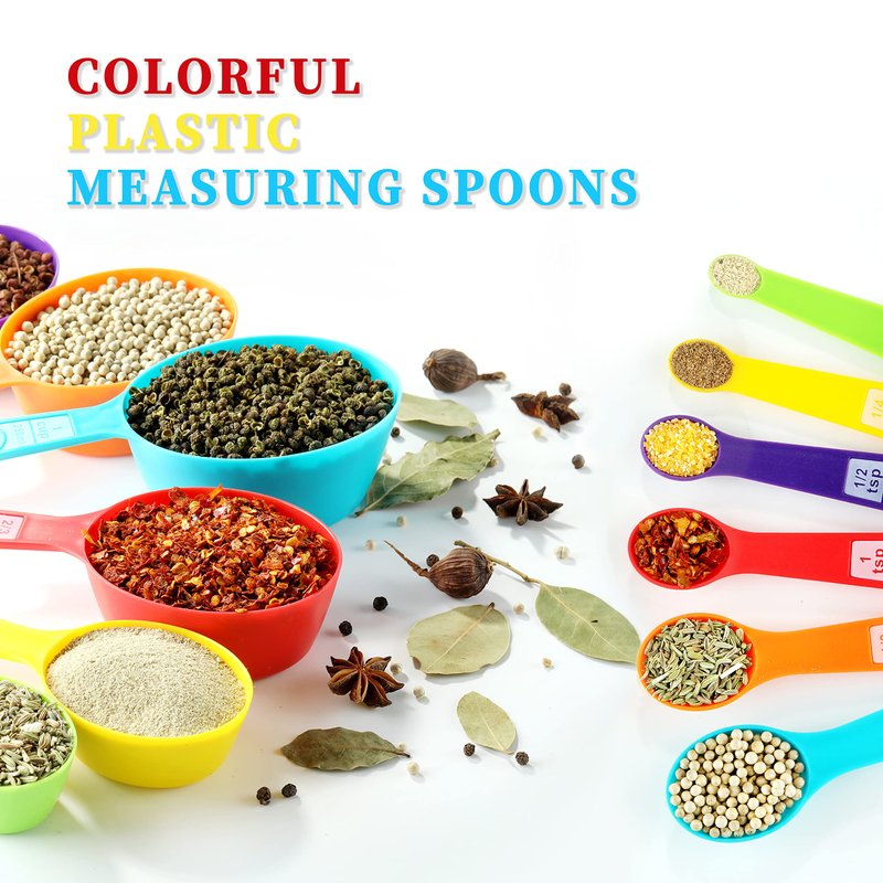 - 5. WHAT YOU GOT: 12pcs measuring cups and spoons set range from 1/8 tsp teaspoon up to 1cup tablespoon and friendly customer service. This measure cups and spoons set makes a great gift for anyone who loves cooking or baking, and the colorful design adds a fun touch to any kitchen.