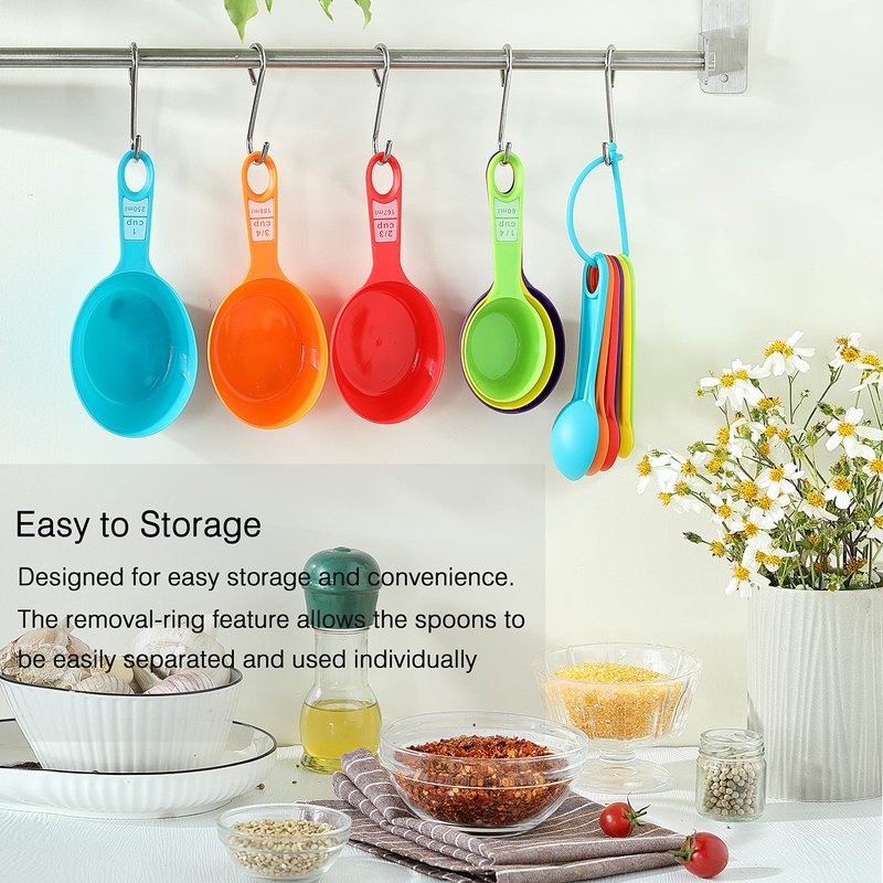 - 3. CONVENIENCE RING: The measuring spoons and cups are held together with a convenient ring, making them easy to store and access when you need them. The ring allows you to keep the spoons organized and together, preventing them from getting lost in a drawer or cabinet. Additionally, the ring can be removed if you prefer to use the spoons individually.