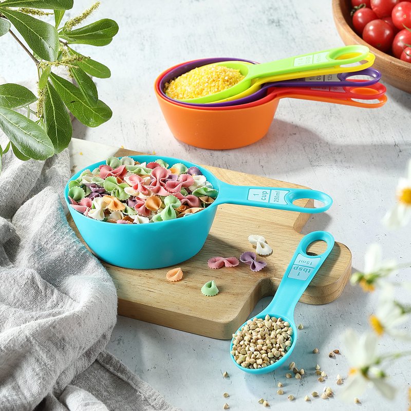 - 4. COLOR-CODED: The cup measuring set come in a range of bright colors, making it easy to quickly identify the right size spoon for the job. The colors also add a fun and playful touch to your kitchen. This feature can be especially helpful if you're working on a recipe that requires you to use multiple spoons at once, as you can easily distinguish between them. Besides, the measure spoon set are dishwasher safe, it saves you time and effort when cleaning up after cooking or baking.