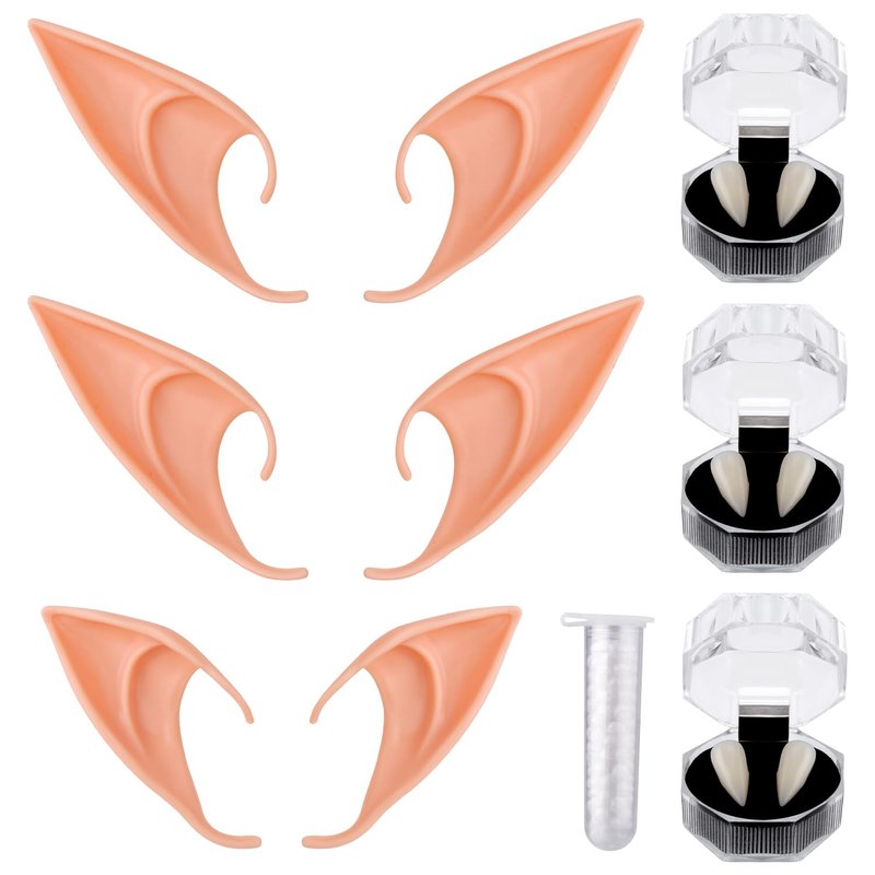 - Package Content: You will get 4 large elf ears, 2 small elf ears, 6 vampire teeth, 1 small bottle of adhesive and 3 cases. Complete kit will meet your Halloween cosplay needs.