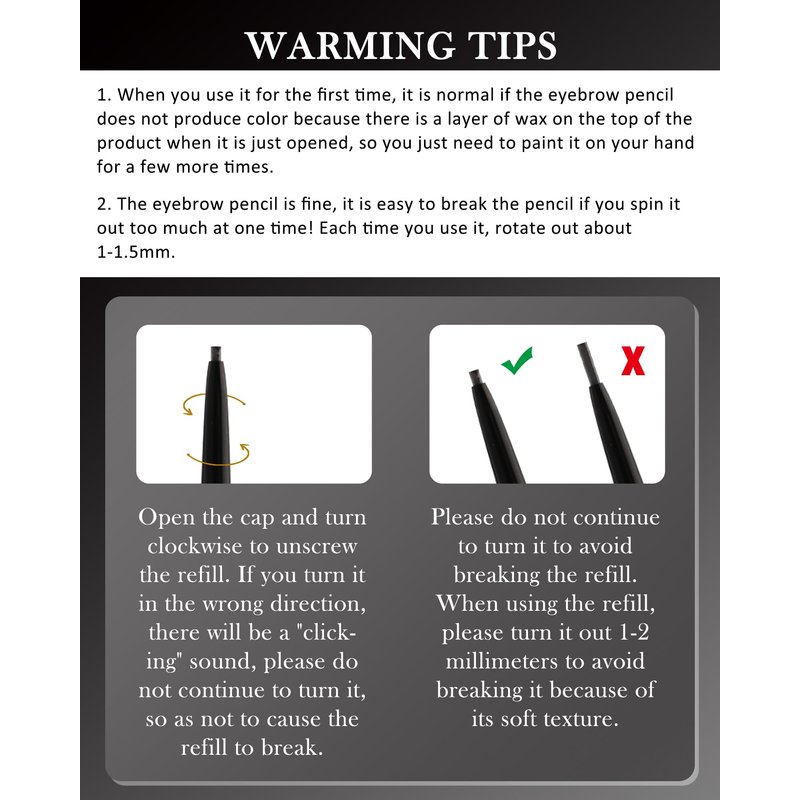- RETRACTABLE & EASY TO USE - This retractable eyebrow pencil can be rotated out to the proper length, and to prevent accidental breakage, it is best to use it with the tip protruding less than 0.2 mm. It applies smoothly and conveniently. Ideal for makeup beginners and professionals. It is very easy to use, simply twist up the pencil slightly until the tip reaches the tip, draw small strokes and then use the brush on the other end to comb through your eyebrows and fill in sparse areas and gaps.