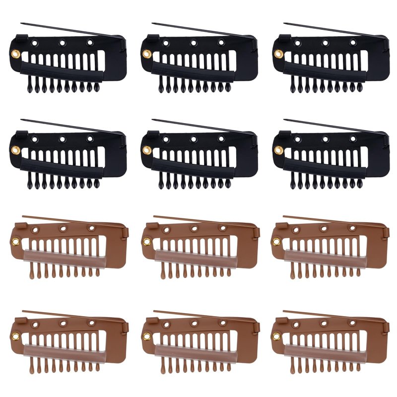 12pcs Wig Clip with Safety Pins, 10-Teeth Hair Extension Snap Invisible Wig Combs to Secure Wig No Sew Chunni Grip Dupatta Clips for Girls Women Wig Headscarf Hijab & Tikka (Black, Brown)