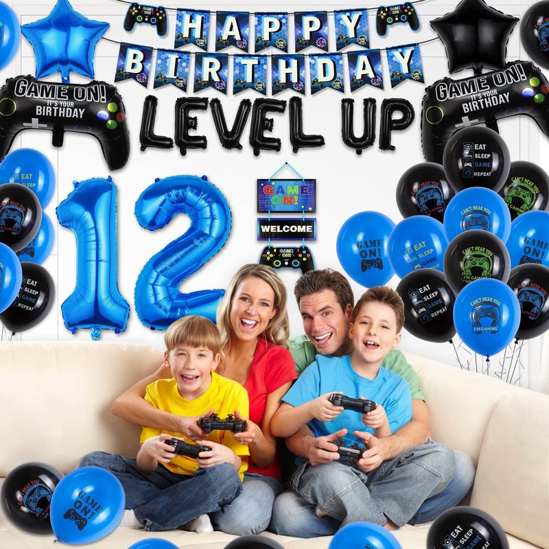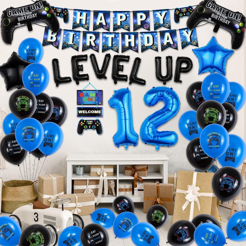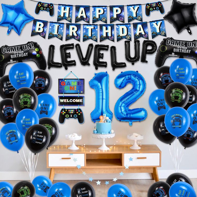 - 🎮【Valued Video Game Party Kit】: Include 1 Game Themed Happy Birthday flag, 1welcome hanging sign, 2 gamepad aluminum foil balloons, 2 stars aluminum foil balloons(1 blue, 1 black), 1 set of 16-inch Level Up foil balloon sets. 1 piece 32-inch number 12 foil balloon, 24 pieces 13-inch gaming latex balloon black and blue.
