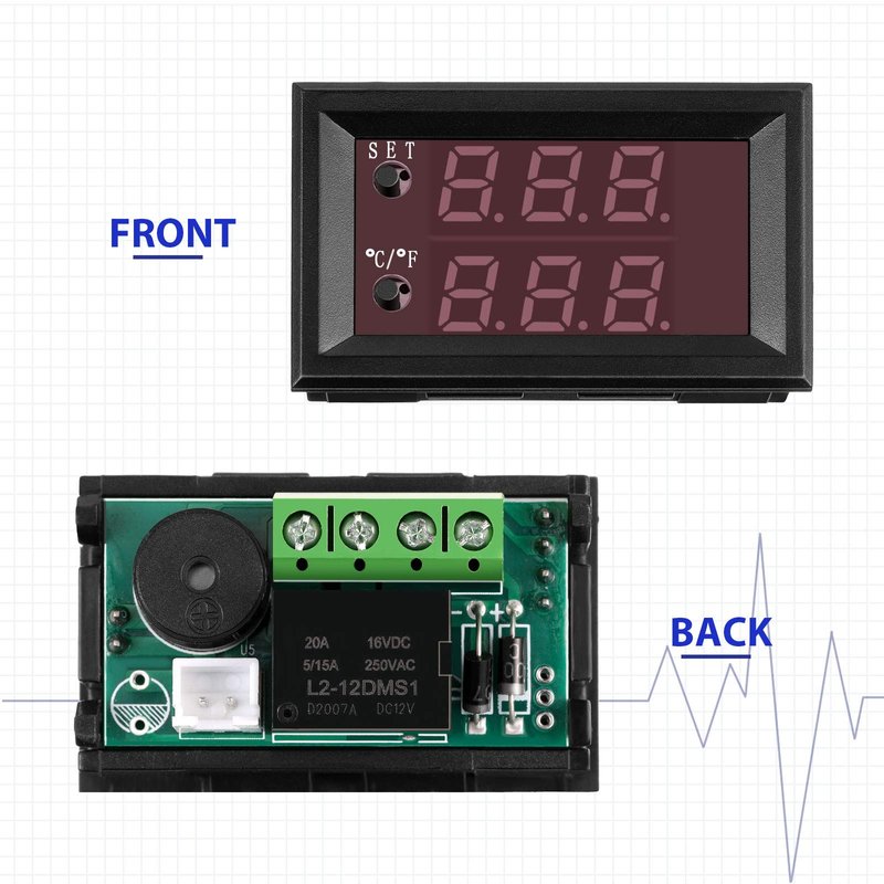 - Dual color LED display: this digital thermostat control module of dual color LED display, which show the measured temperature (red) and set temperature (blue) at the same time, which can be applied for cooling/ heating mode, you can test indoor or outdoor temperature