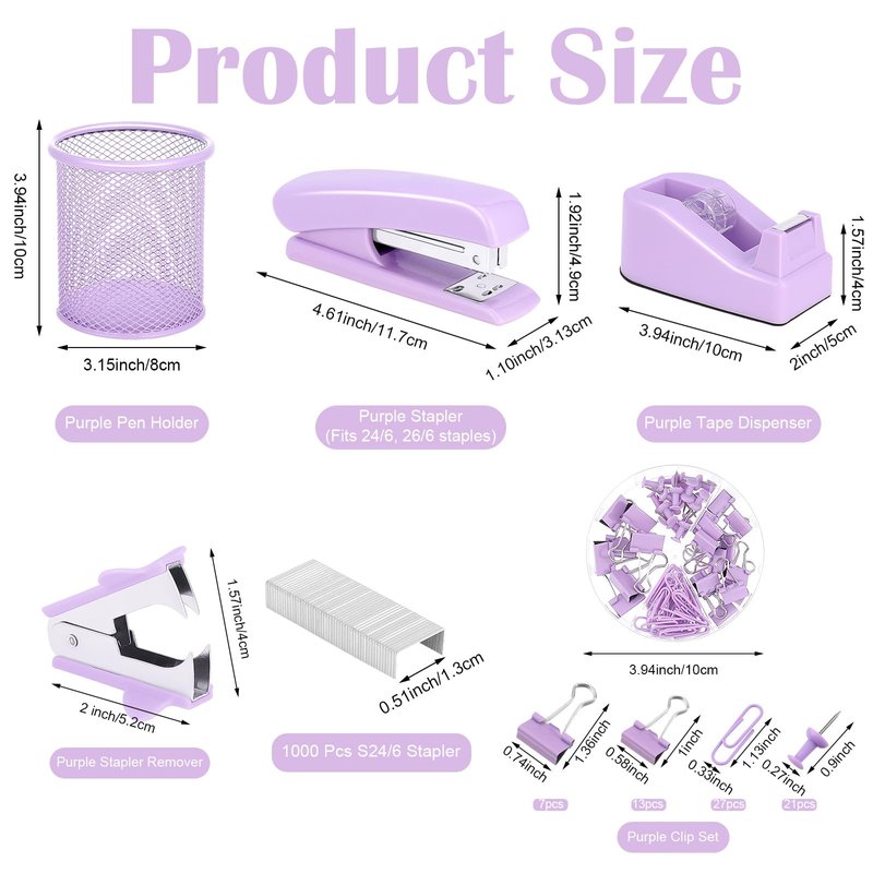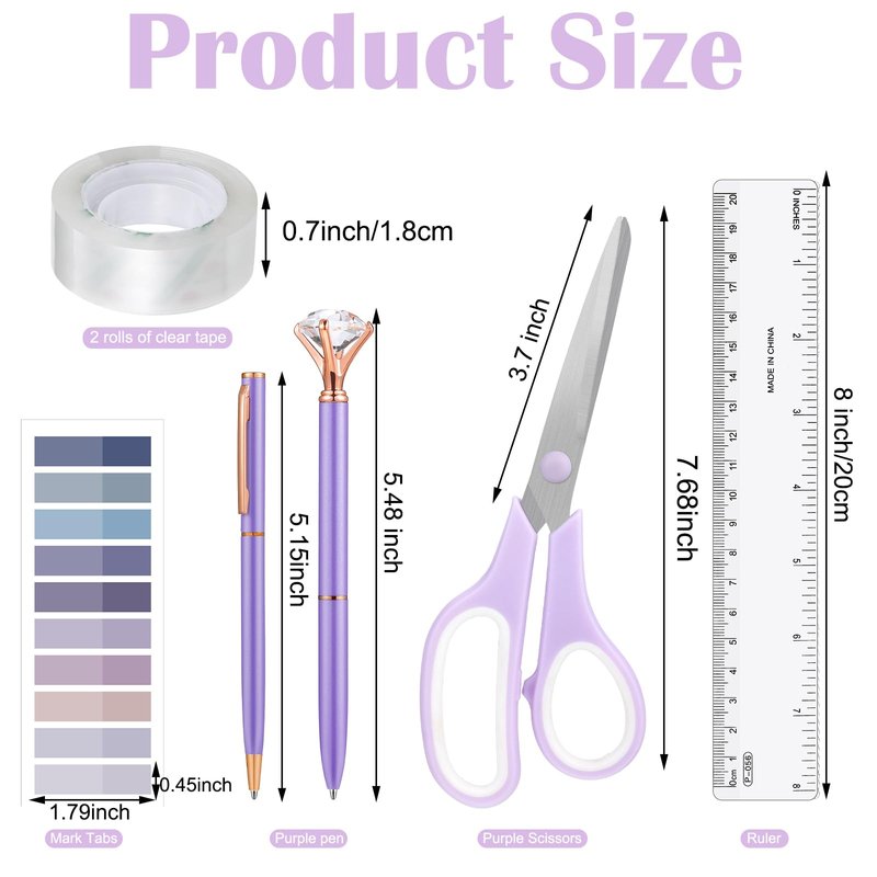 - 【Product Size】Purple stapler approx 4.74 x 1.24 x 1.94 inches, tape dispenser approx 4 x 2.05 x 1.65 inches, staple remover approx 2.19 x1.55 inches, staple type 24/6, purple pen holder approx 3.78 x 3.15 inches, tape the width is about 0.68 inches, scissors is about 7.48 inches, diamond ballpoint pen is 5.47 inches, the clip has a storage box, the size of a single sticky tabs is 1.77 x 0.45 inches, and the ruler is 8 inches (Please confirm the size before buying)