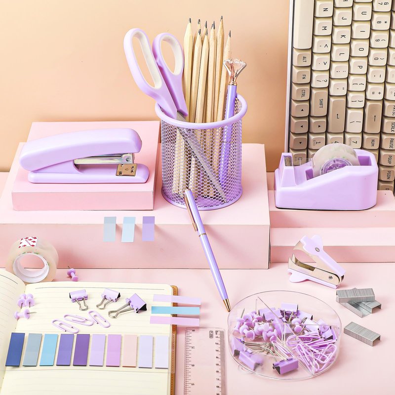 - 【Package Includes】You will receive a complete purple office supplies set, including 1 purple stapler, 1 purple tape holder, 2 clear tapes, 1 staple remover, 1 pen holder, 1000 24/6 staples, 1 scissors, 1 ruler, 1 tabs, 1 diamond ballpoint pen, 1 purple pen, 1 clip set (includes 30 paper clips, 7 large binder clips, 15 small binder clips, 20 thumbtacks)