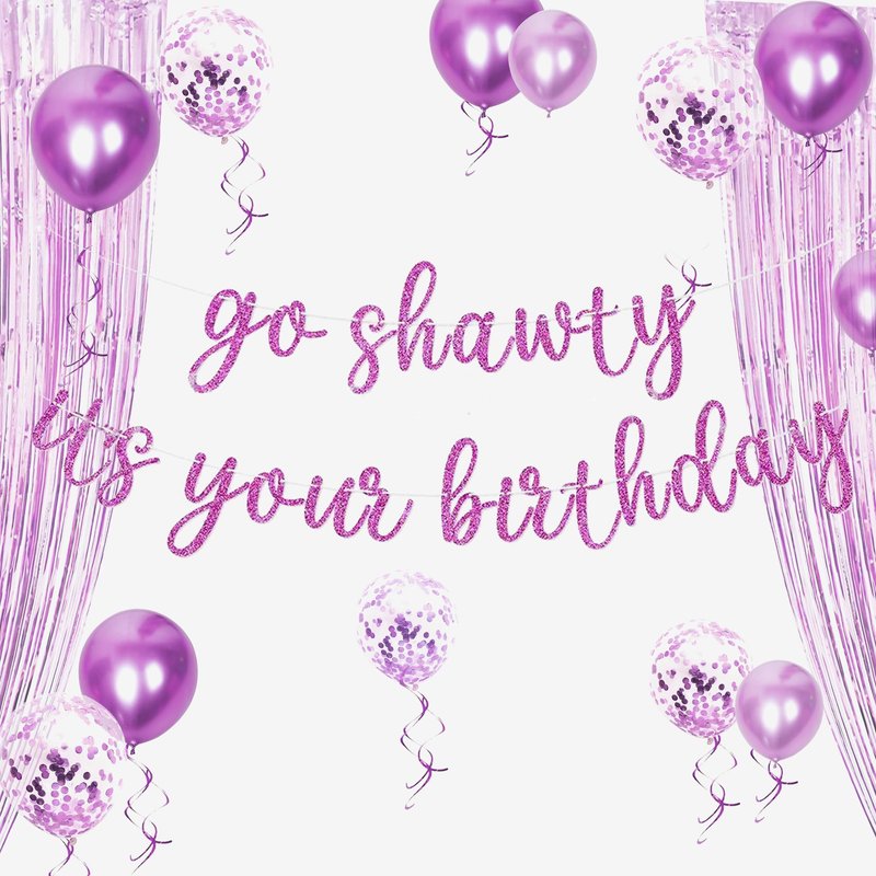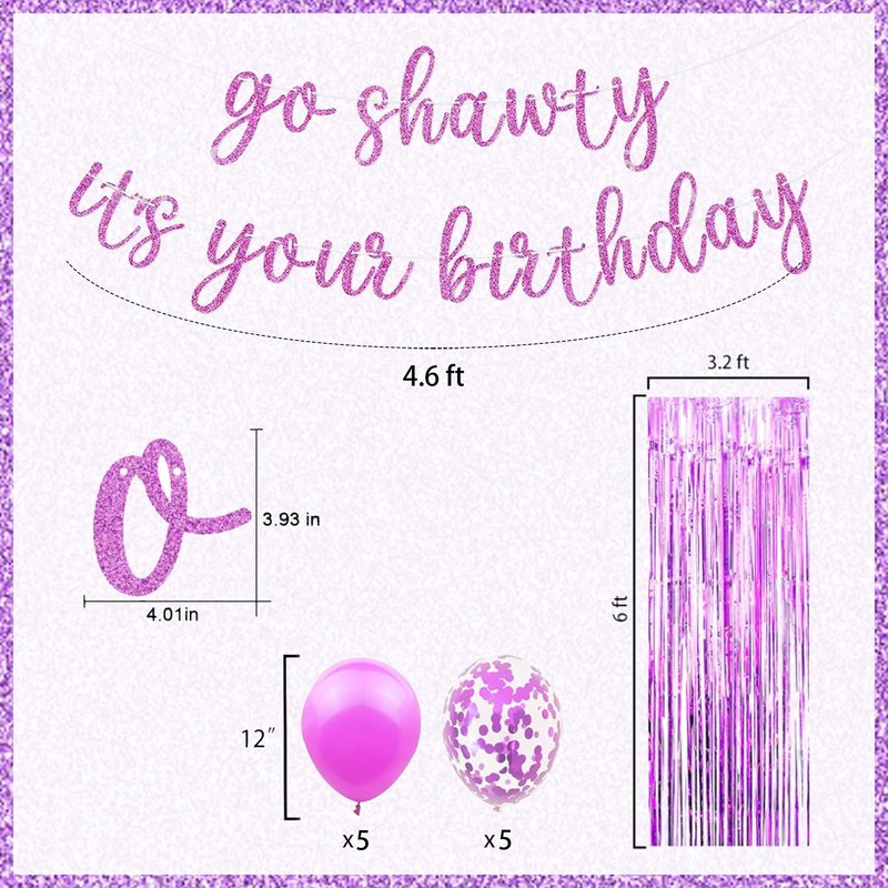 - Package include: 1 X Purple glitter Go Shawty It's Your Birthday Banner,10 X Purple balloons,1 X rain curtain,The dimensions are shown in the figure!