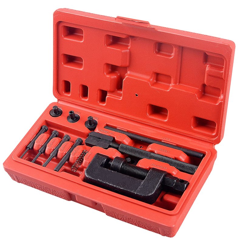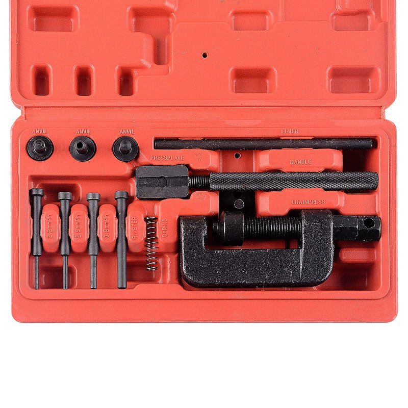 - Practical: Use the Chain Breaker 13-Piece Set with Carrying Case – Chain Cutter and Riveter for Motorcycle, Bike, ATV to remove and reinstall motorcycle/bike, rear drive, and OHV cam chains that are #35 to #630; Tool completely pushes out the chain link pin