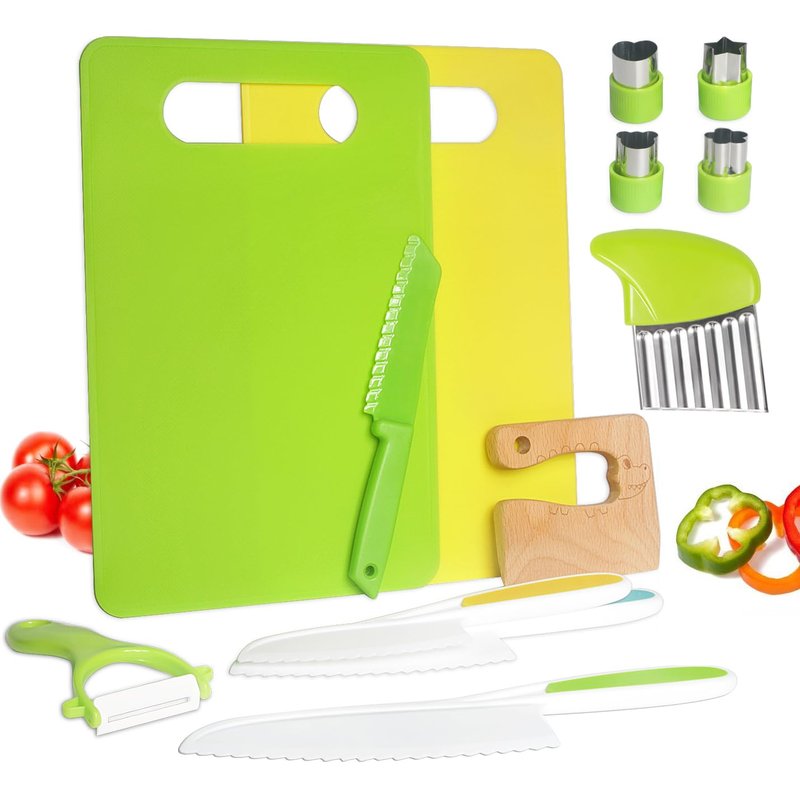 - PACKAGE INCLUDES: 1 piece of wooden kids cutter, 4 pieces serrated edges toddler cutters, 2 pieces cutting board, 1 piece Y peeler, 4 pieces plastic cutters of different sizes, 1 piece crinkle cutter, a variety of styles and uses of toddler kitchen tools can meet the needs of kids usage requirements.