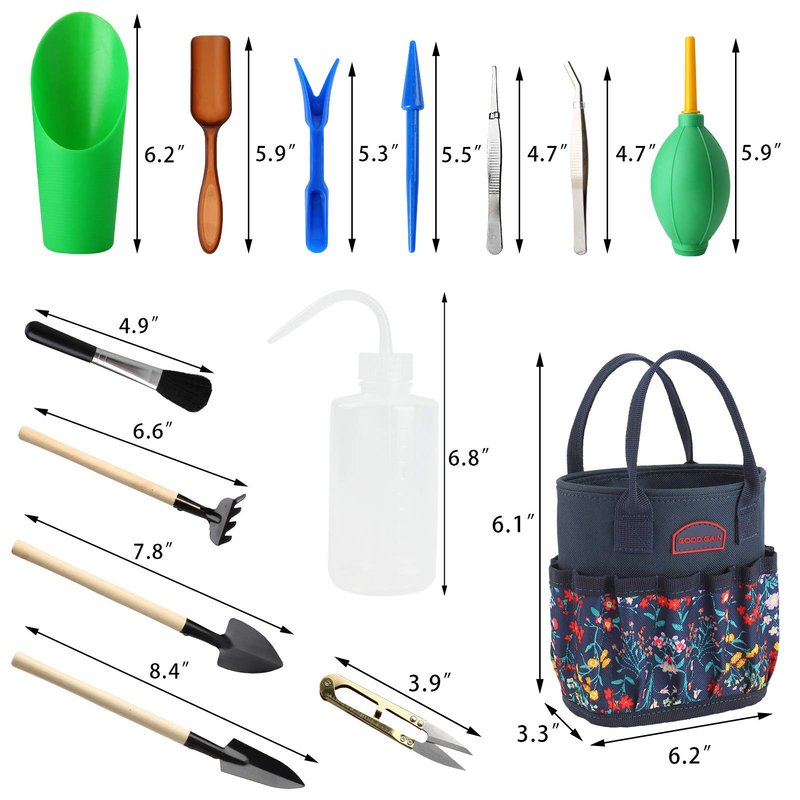 - MINI PLANTS CARE KIT: This kit features 13 essential gardening tools neatly organized in a storage bag with pockets. It includes a drip bottle, shovel, rake, spade, air blower, tweezers, scissors, and more—perfect for all your gardening needs
