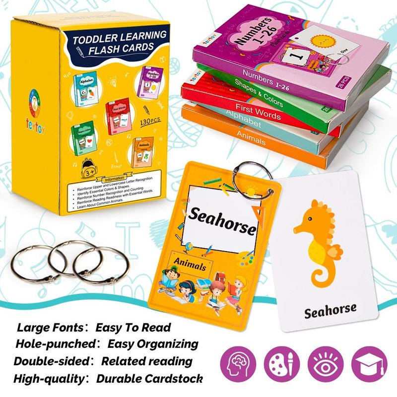 130 Flash Cards for Toddlers, ABC Alphabet, Numbers, Colors & Shapes, First Words, Animals Preschool Flashcards with Rings for Kindergarten Homeschool Supplies Educational Learning Toy Kids
