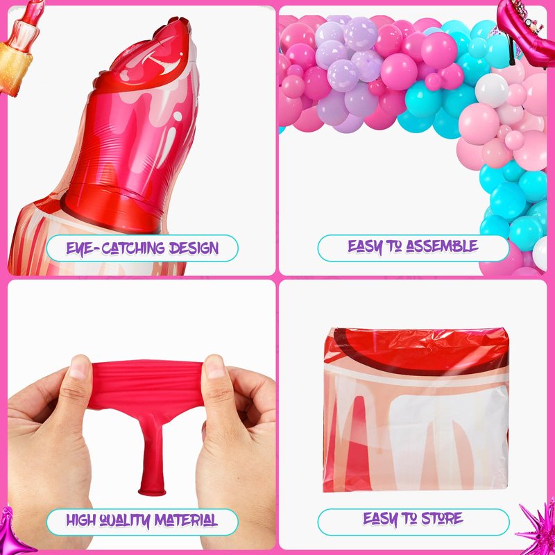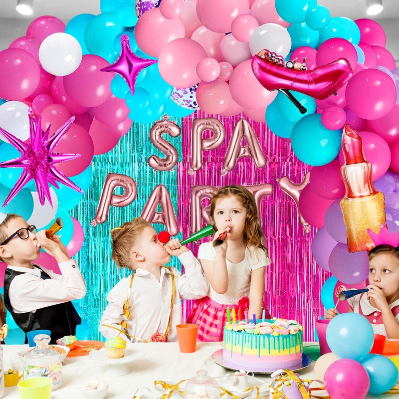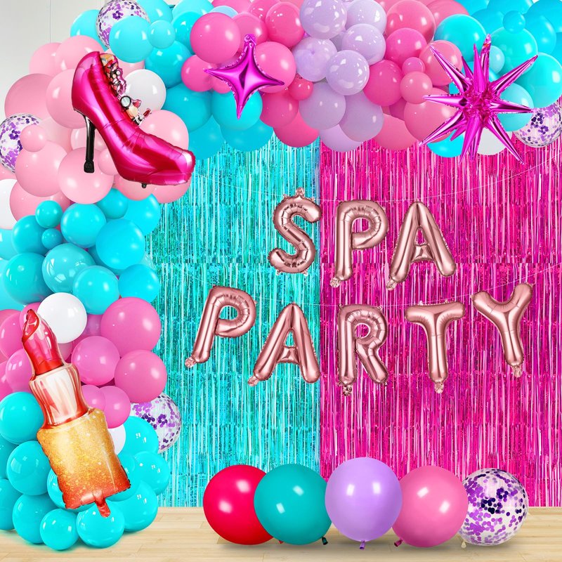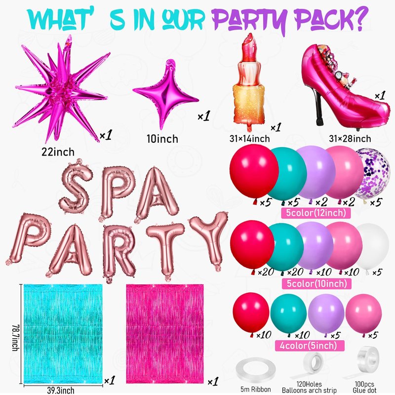- What you will receive: Are you struggling to decorate your spa theme party, our spa theme party decorations are just right for you. Our set consists of 114pcs spa party balloons, which come in a variety of colors, in addition to 8pcs 16-inch letter foil balloons, 1pc 25-inch high heel foil balloon, 1pc 37-inch lipstick foil balloon, 1pc 22-inch exploding star foil balloon, 1pc 10-inch star foil balloon, 1pc lake blue fringe curtain, 1pc hot pink fringe curtain, we have also kindly equipped you with a white ribbon, dot tape, positioning belt and straw, to meet your spa party use
