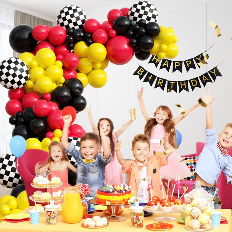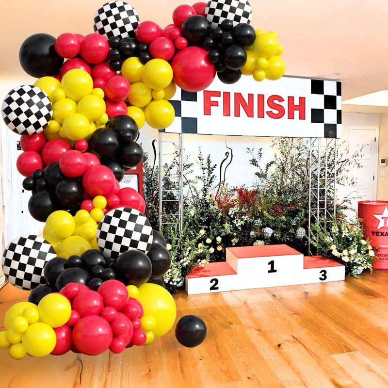 - What You Get: The race car balloon arch kit include 46pcs red balloons(18inchx1, 12inchx10, 10inchx15, 5inchx20), 46pcs black balloons(18inchx1,12inchx10, 10x15, 5inchx20), 31pcs yellow balloons(18inchx1, 10inchx15, 5inchx15), checkered balloonsx5, wheel tire balloonsx1, ribbonx1, decorative stripx1, glue dotsx100