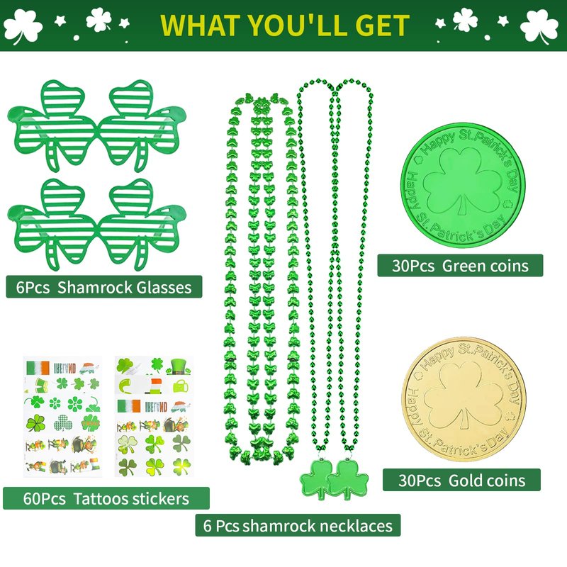 - GREAT VALUE SET: The St. Patrick's day party favors set include 60 temporary tattoos, 60 shamrock lucky coins, 6 shamrock glasses and 6 shamrock necklaces. These Irish Day accessories are perfect for any upcoming Saint Patricks Day neighborhood parties, or Irish-themed bachelor or bachelorette events.