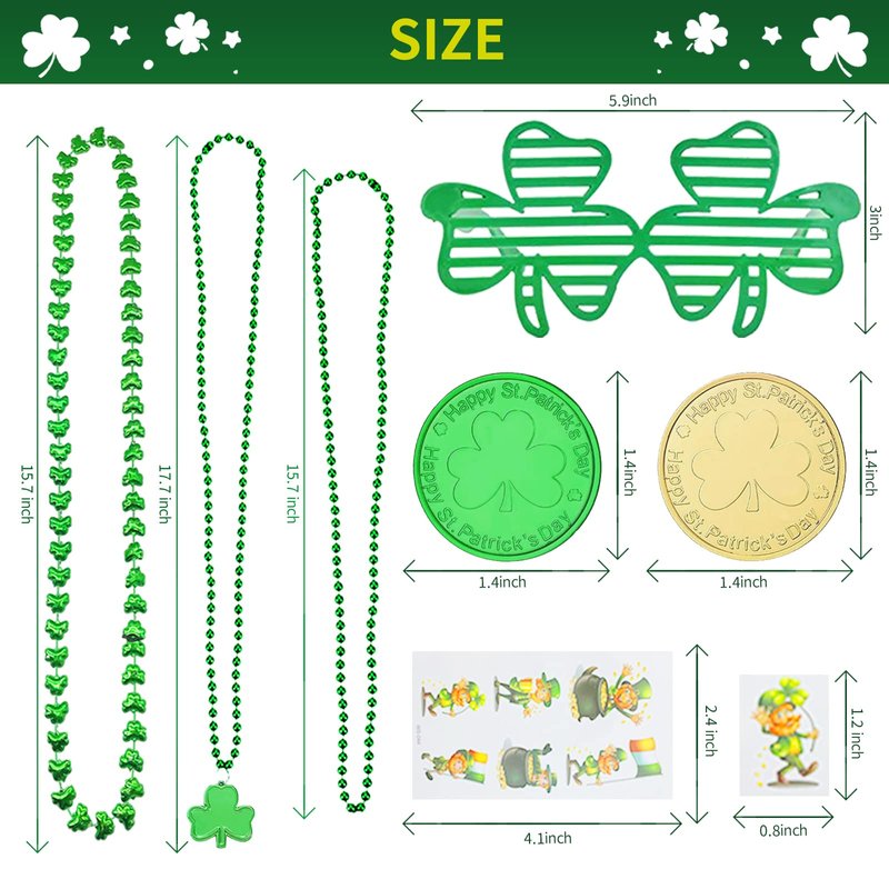 - PREMIUM & REUSABLE: The shamrock glasses are 5.9x2.8in, necklaces 30in, plastic gold coins 1.4in, and tattoo stickers are 10 sheets 1.5x0.7in more than 60pcs. All of these are made from environment-friendly materials, if stored properly, you can reuse them for next party!