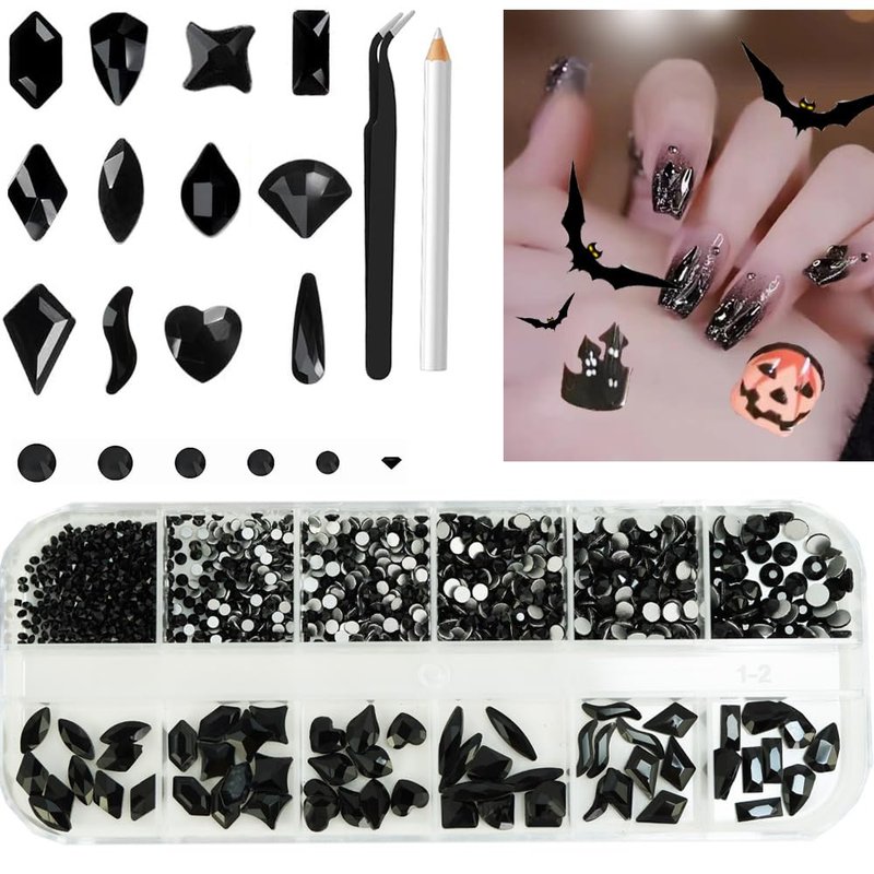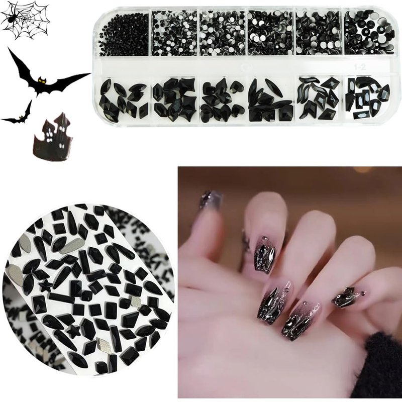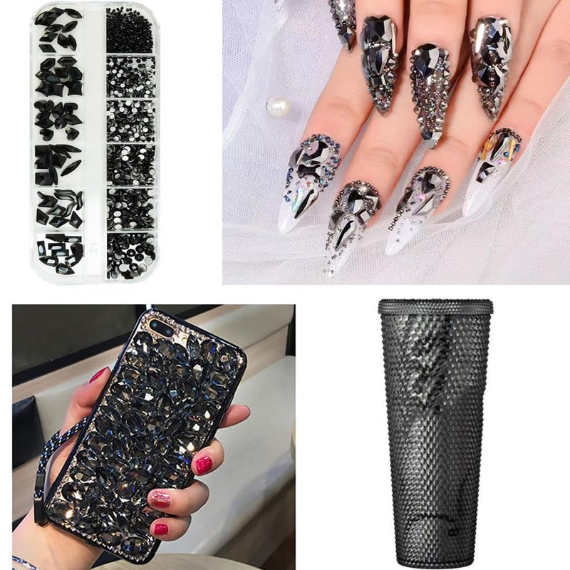 - Black Rhinestones For Nail Faces Eyes Makeup: black gem nail rhinestones set is perfect for creating Halloween nail art or decorating jewelry, makeup, body art, DIY crafts, wedding dress or shoes, cell phone cases, glasses, greeting cards, bags, guitars, Scrapbooks etc DIY clay production, DIY craft projects, clothing, wedding dresses, books, Christmas decorations, gift packaging, decoration, ceramics, greeting cards, logos, faces, eyes, cosmetics, computers, phone cases, invitation letters etc.