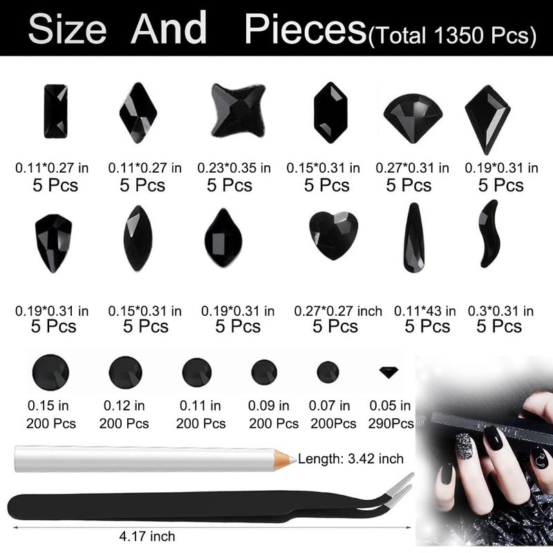 - Package Includes: 1 box black Nail rhinestone stones set----6 grids of 12 kinds of different big black clear nail rhinestones (each style for 5 pieces, 12 kinds*5pcs =60pcs), -----6 styles (total 1290 Pcs ) black flatback round beads(1.6mm~3mm). 1.6mm* 290pcs; 2.1mm*200pcss; 2.3mm*200pcs, 2.6mm*200pcs, .2.8mm*200pcs, 3mm*200pcs, 1 pick up tweezers, 1wax pen. You can easily DIY your ideal art decoration.