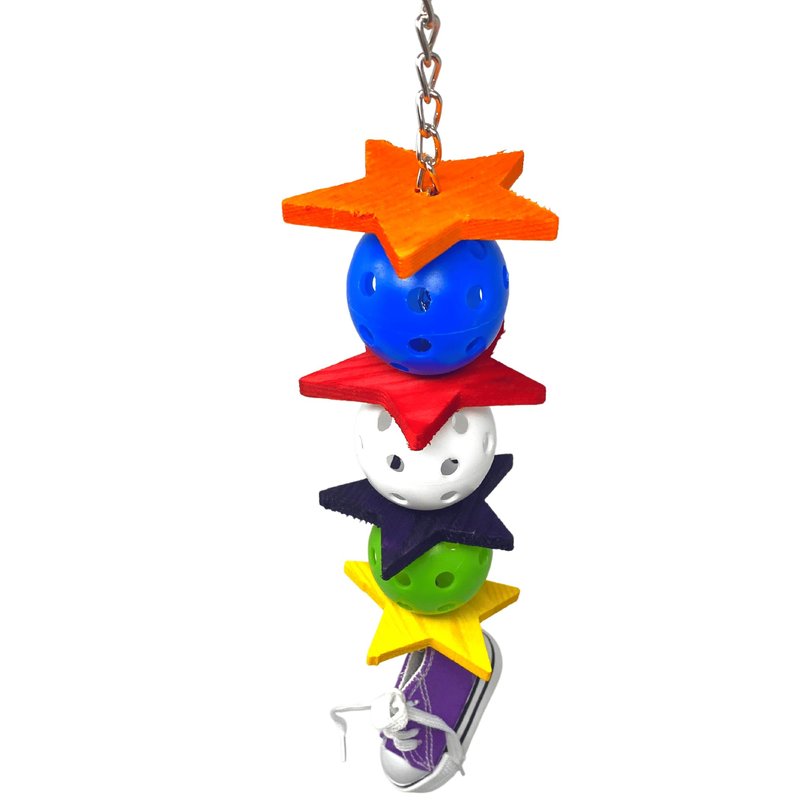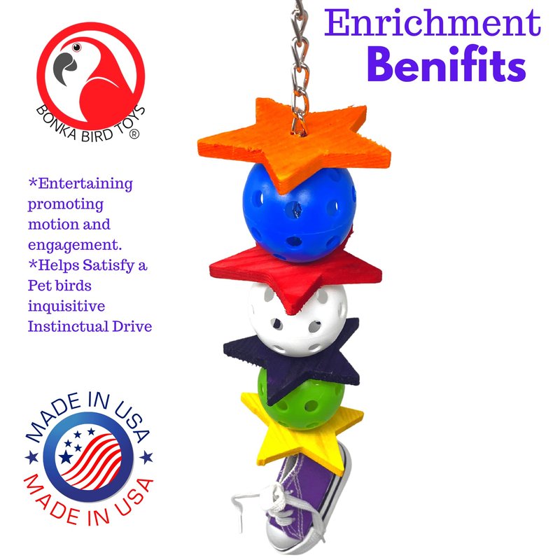 The 1355 Kickball Sneaker from Bonka Bird Toys is a super bird enticing chewable and pullable medium-sized bird toy! This appealing bird toy has a great assortment of materials and parts to thrill your feathered friend! At the top of the bird toy, there is a quick link attachment for fast and easy hanging in the aviary. A small sturdy link chain hangs down from the connector continuing through the entire toy ending with a small metal ring. This metal ring has an assorted color bird-safe cotton sneaker hanging from it. The sneaker is brightly colored, and has bird-safe laces that can be pulled on the front and real sneaker parts including a soft rubber sole. On the main body of the bird toy there are (4) colorful wooden chew stars that each separate a jingle ball. These (3) jingle balls have small rattlers inside of them and make wonderful bird-pleasing noises whenever the toy is played with. The small sturdy link chain allows this toy to swing all about when your pet plays with it and the assorted colors make it stand out in any cage. The 1355 Kickball Sneaker is 100% bird-safe, ships in assorted bright bird pleasing colors, and weighs and measures approximately: Height: (12.75) inches or (12 3/4) inches Width: (2.5) inches or (2 1/2) inches Weight: Under (4) ounces