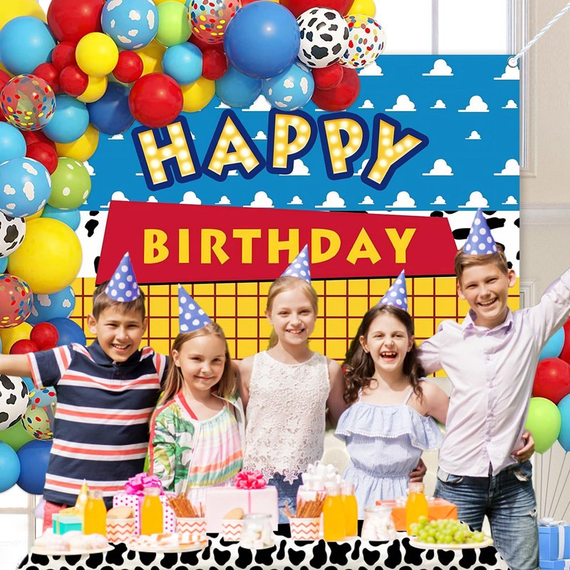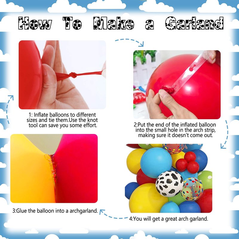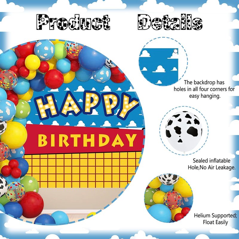 - Party Balloons Kit: come with 35 latex balloons(12 in), 50 latex balloons(10 in),45 latex balloons(5 in),1pcs balloon strip, 1pcs roll glue dots,1pcs Cartoon Theme Background.