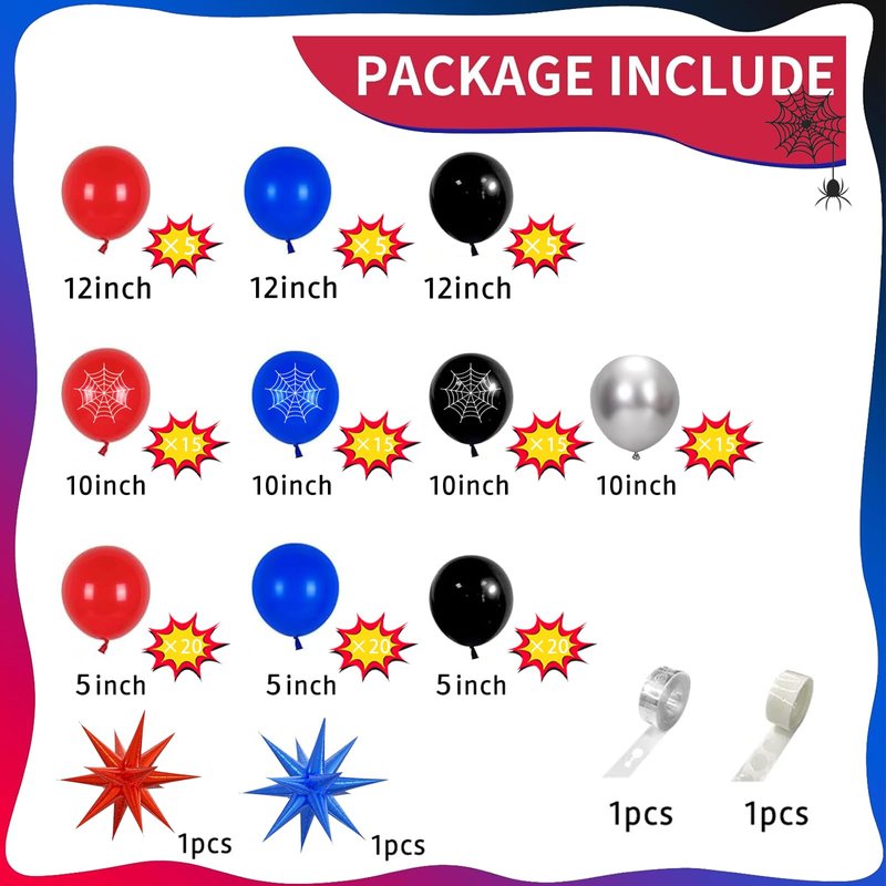 - 【Cartoon Spider Theme Balloon Arch Kit】Total 139 pcs 15 latex balloons(12 in), 60 cute printing pattern latex balloons(10 in),60 latex balloons(5 in),2pcs exploding star balloons,1pcs balloon strip,1pcs roll glue dots