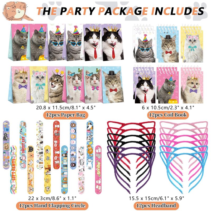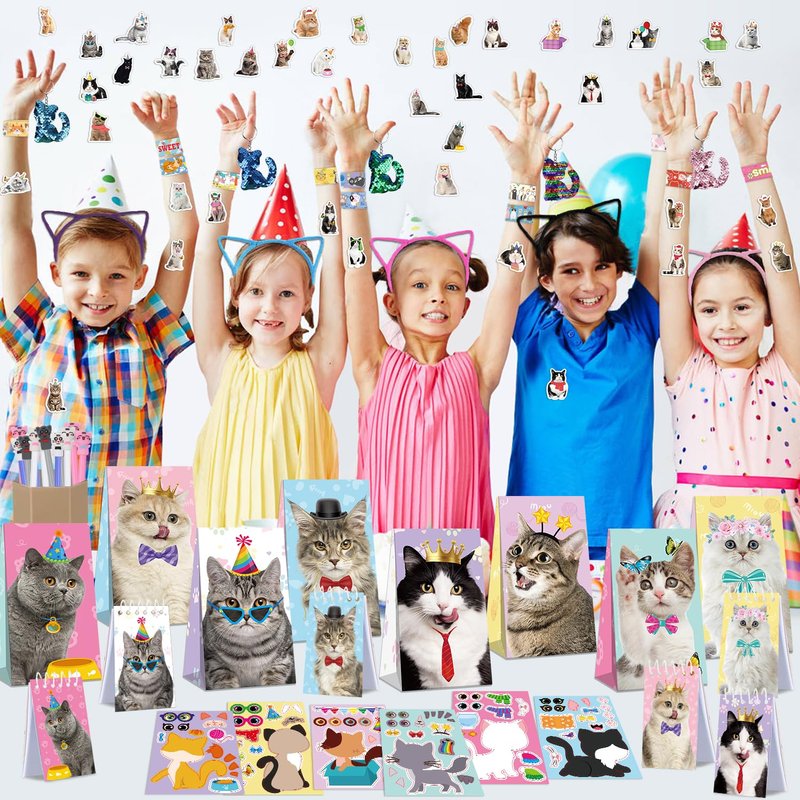 - You Will Get: You will get a total of 139 pieces of cat birthday party favors, 12PCS cat stickers with 6 different designs, 12 Cat Slap Bracelets, 12PCS Cat Ears Headband, 12PCS Cat Animal Mini Notepad, 12PCS Cat Face Pen, 12PCS Cat Keychain, 12PCS Cat Party Favor Bag, 42 sheets of kitten theme stickers, enough quantity and cool styles can meet your needs for various kinds of cat kitten party supplies.
